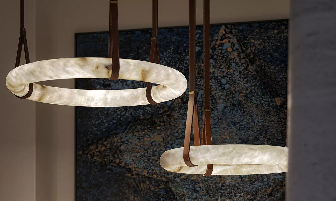 This Circle & rectangular alabaster chandelier combines natural elements with modern design, making it an artistic lighting tool. Its main body is carefully made of high-quality alabaster. Each piece of alabaster has a unique texture and color, showing the uncanny craftsmanship of nature.