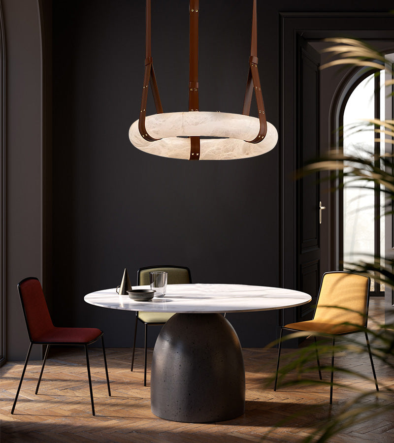 White Marble Circle Leather Alabaster Chandelier-Turn On