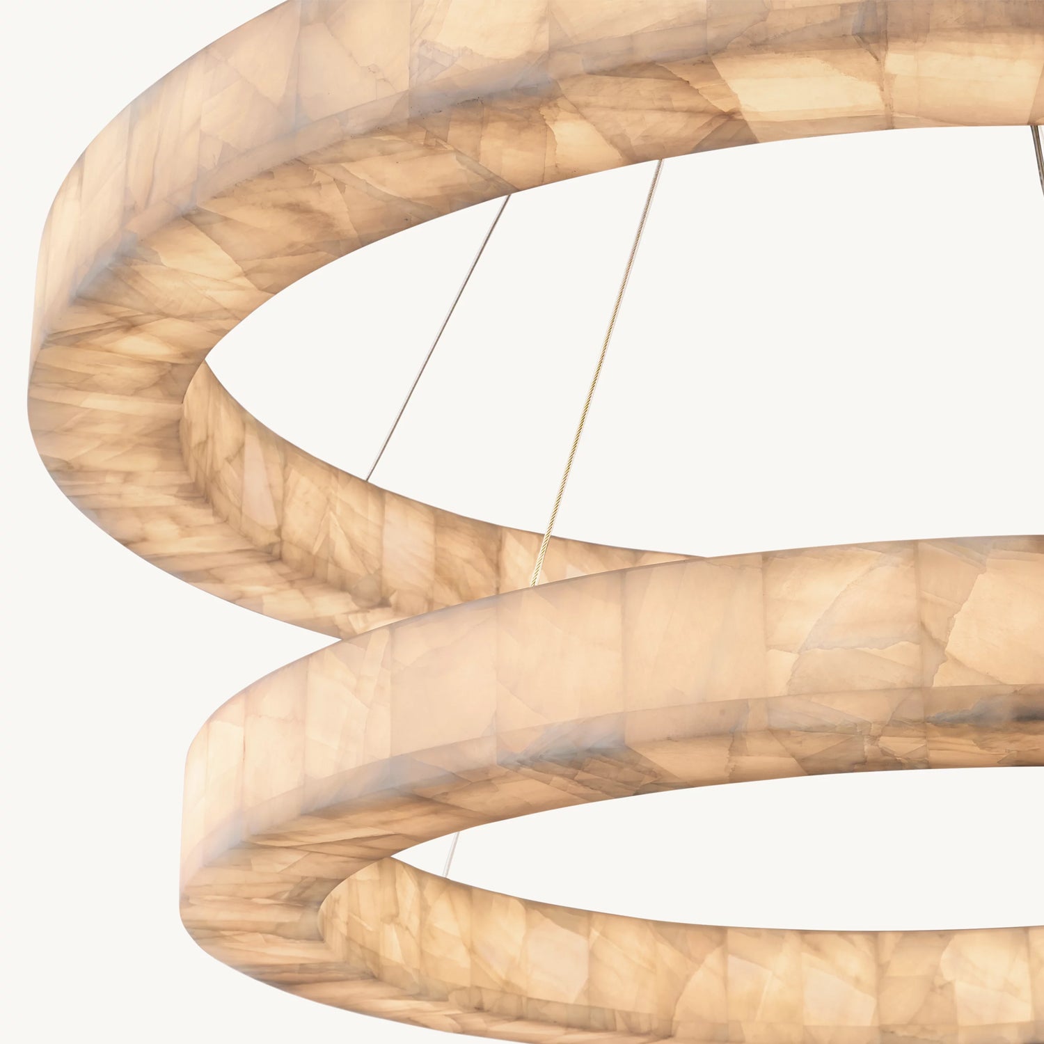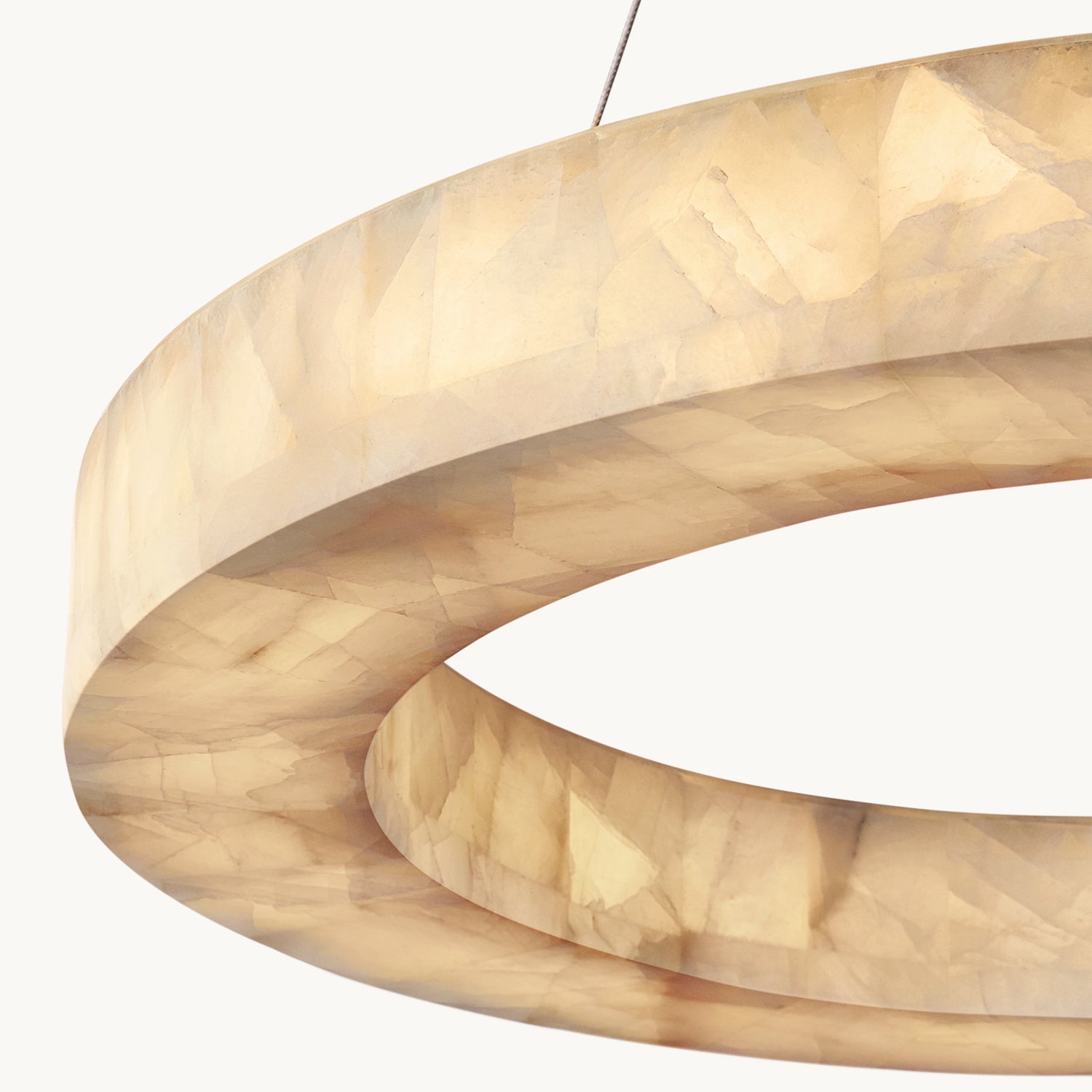 Effortlessly capturing calcite's essence, the Round Chandelier exudes a serene, natural glow. Crafted with meticulous halos of polished stone suspended by sleek steel cables, it forms a seamless silhouette. Enhanced by internal illumination, each piece displays a unique interplay of organic textures and tones, making a remarkable impression.
