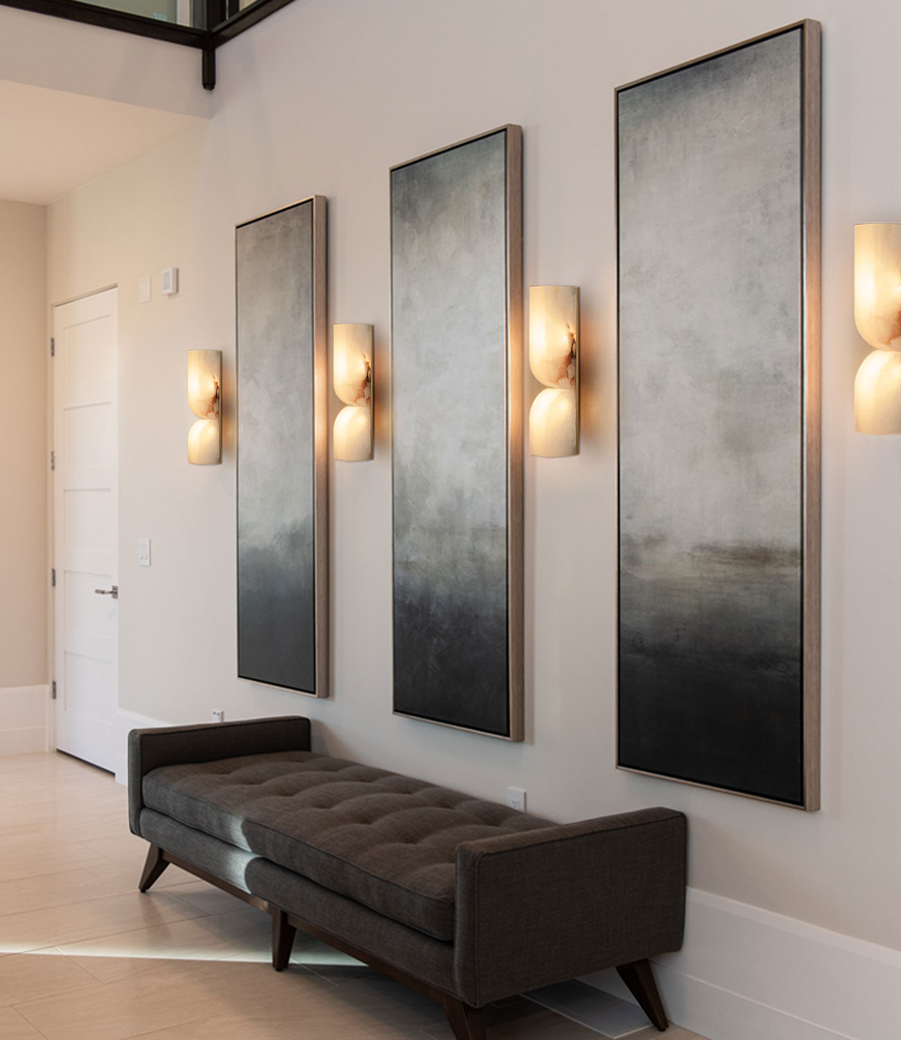 The metal frame rear fittings create an attractive backdrop against the white alabaster shadows in front.Enable soft ambient light to gently wash over the walls to accentuate their beauty, allowing the shadows to glow warm and inviting.