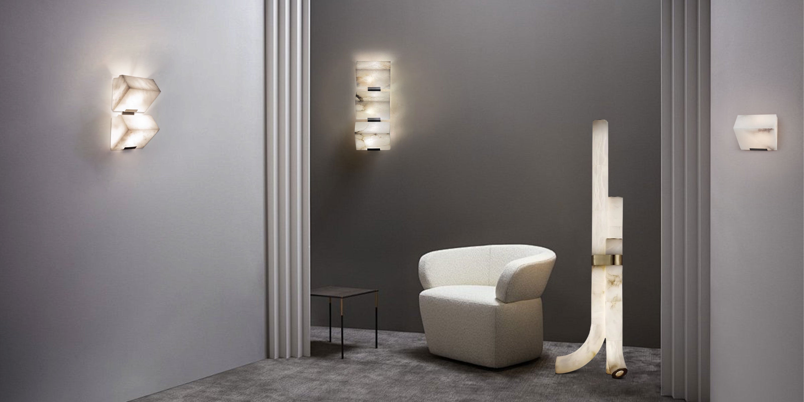 - Matte black metal frames soften against organic white alabaster veins. Alabaster’s mineral variations shine.