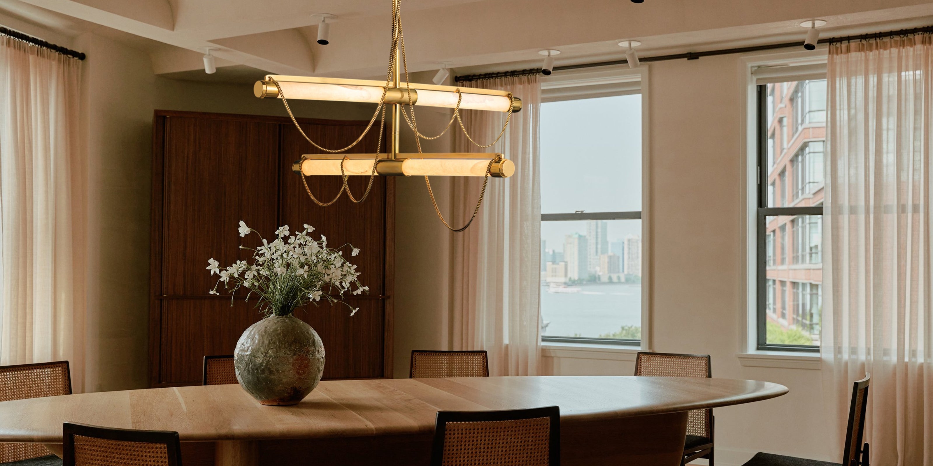 Natural tubular alabaster shades diffuse light softly, casting a warm, museum-quality glow that enhances any ambiance.