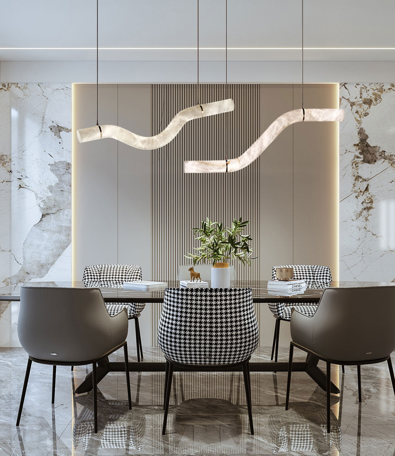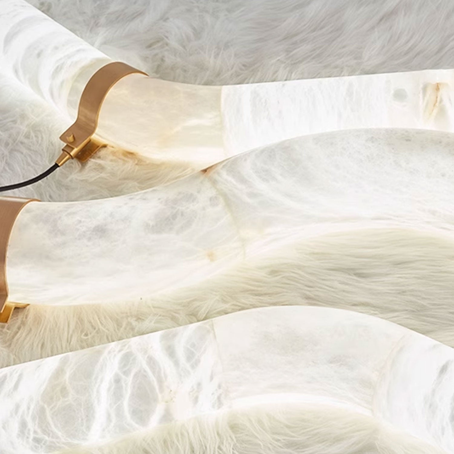 An exploration of balance and expressive sculpture, this series alabaster chandeliers focus in any environment. Consisting of a closed loop structure, the sinuous form nods to the mathematical symbol for infinity and the never-ending flow of light through time and space.