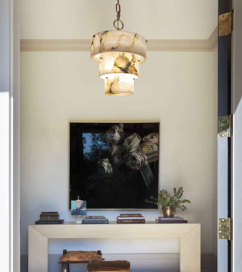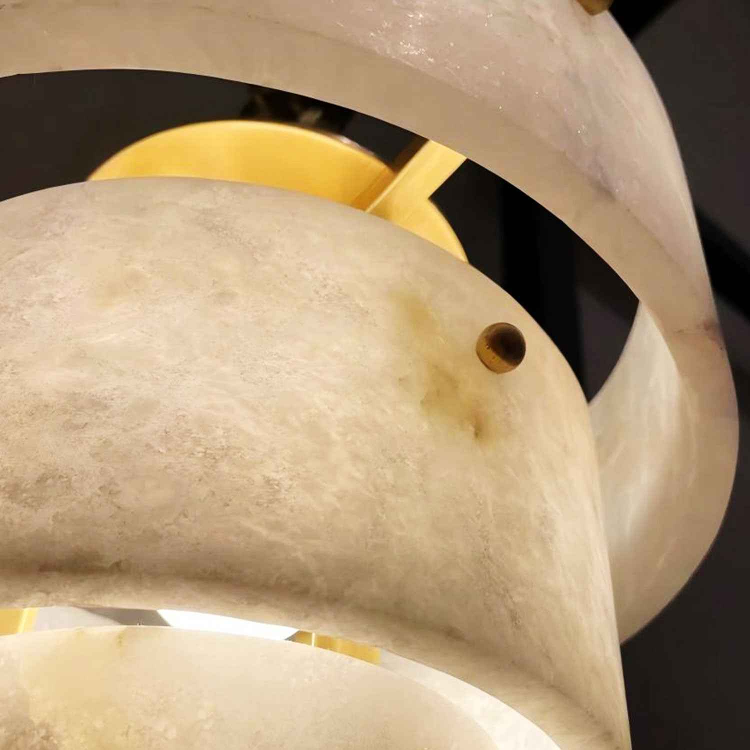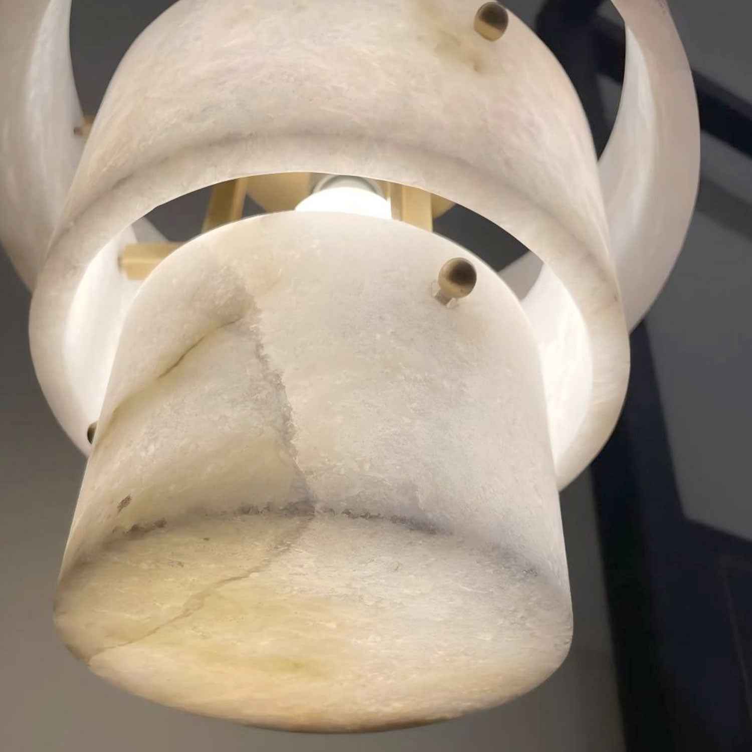 Gleaming golden brass elements frame the pendant, adding a touch of opulence while complementing the alabaster’s soft, earthy tones.