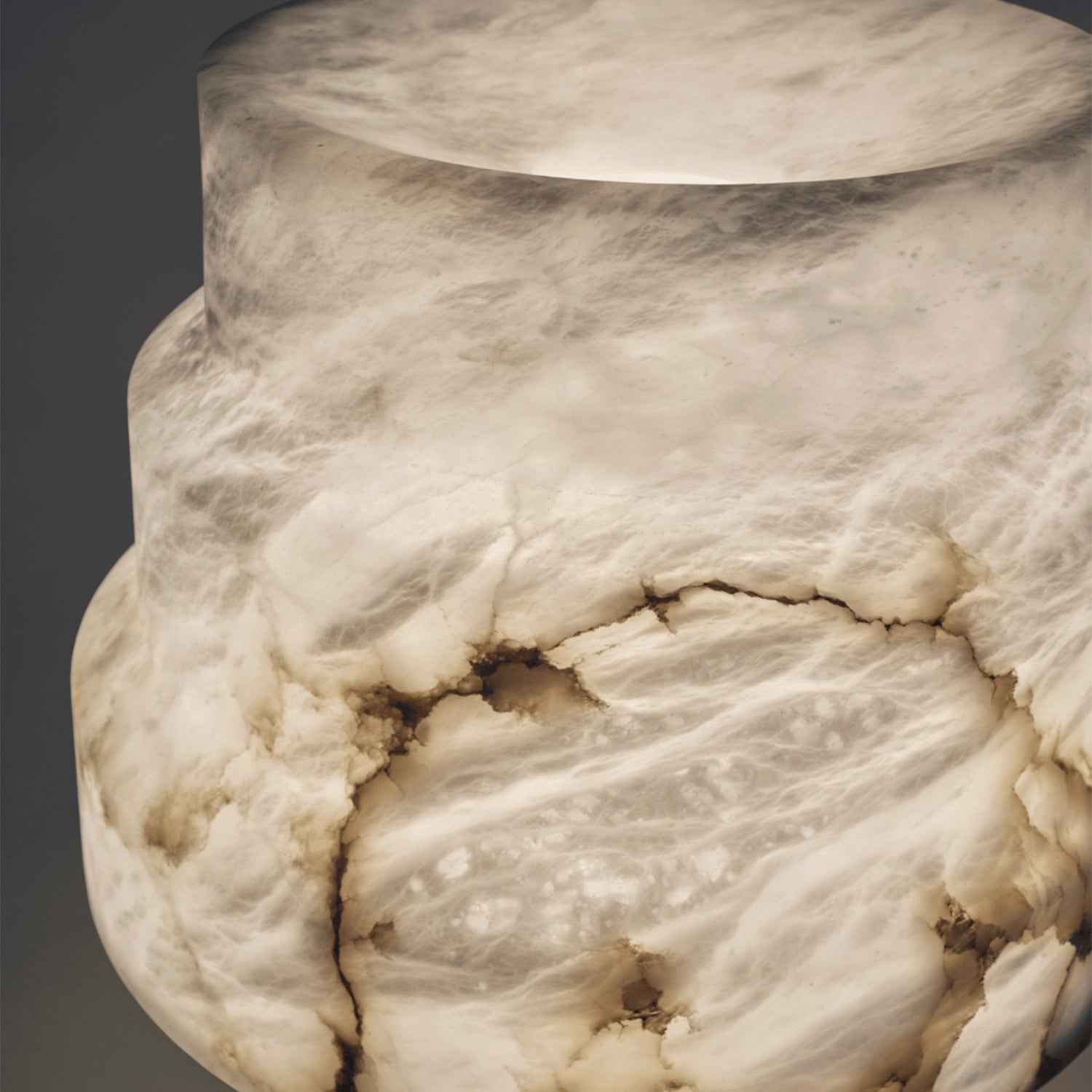 Carved from solid alabaster, which features natural fissures and veining, making each one truly unique.