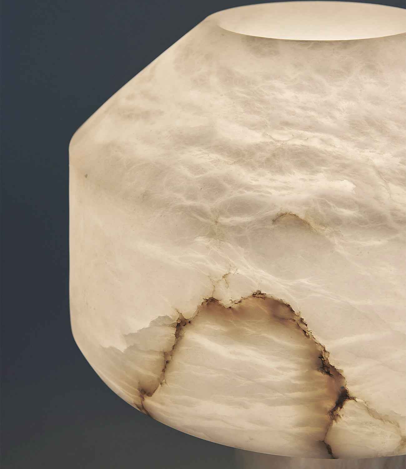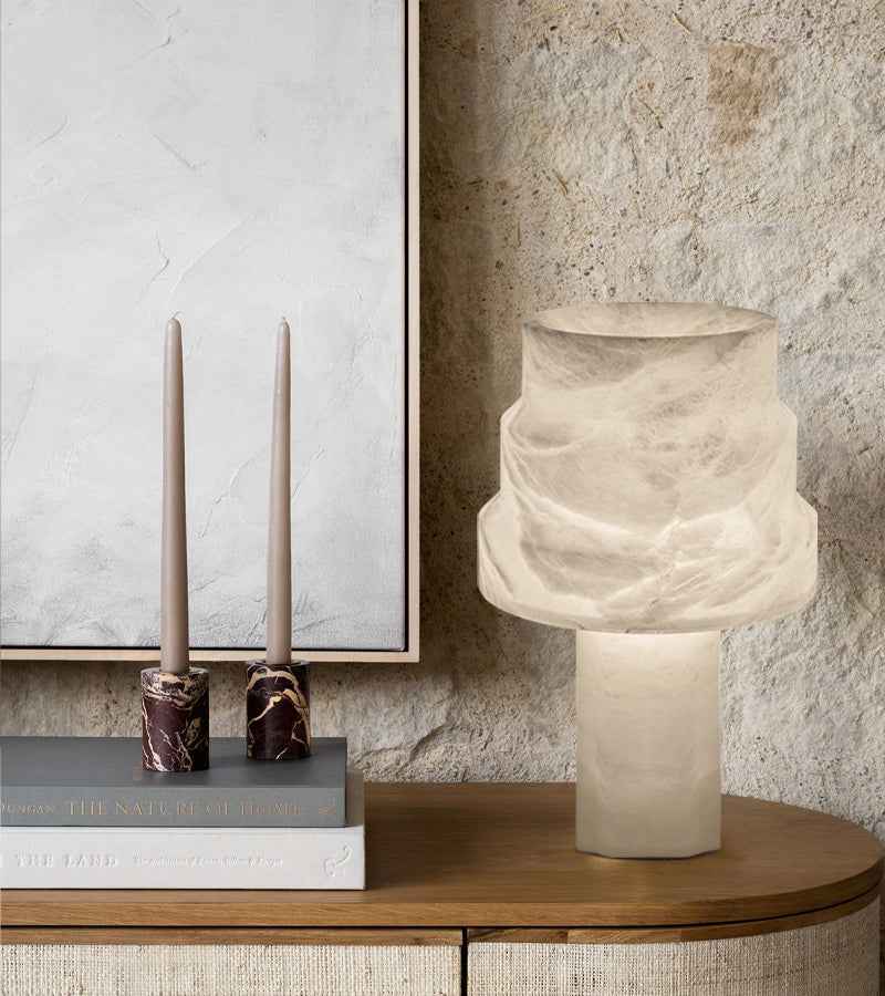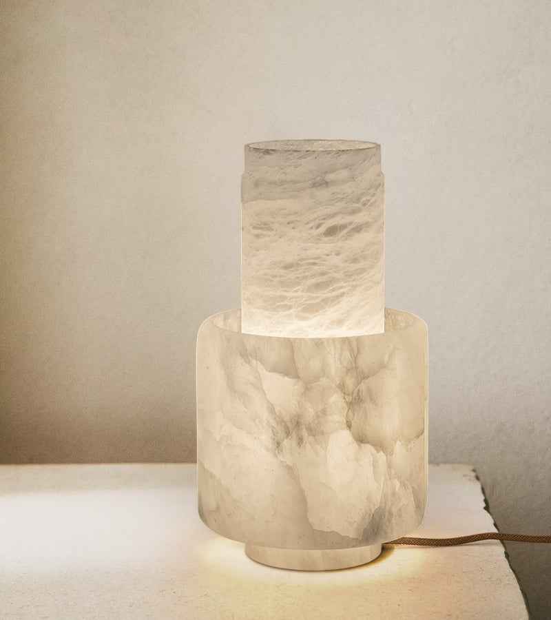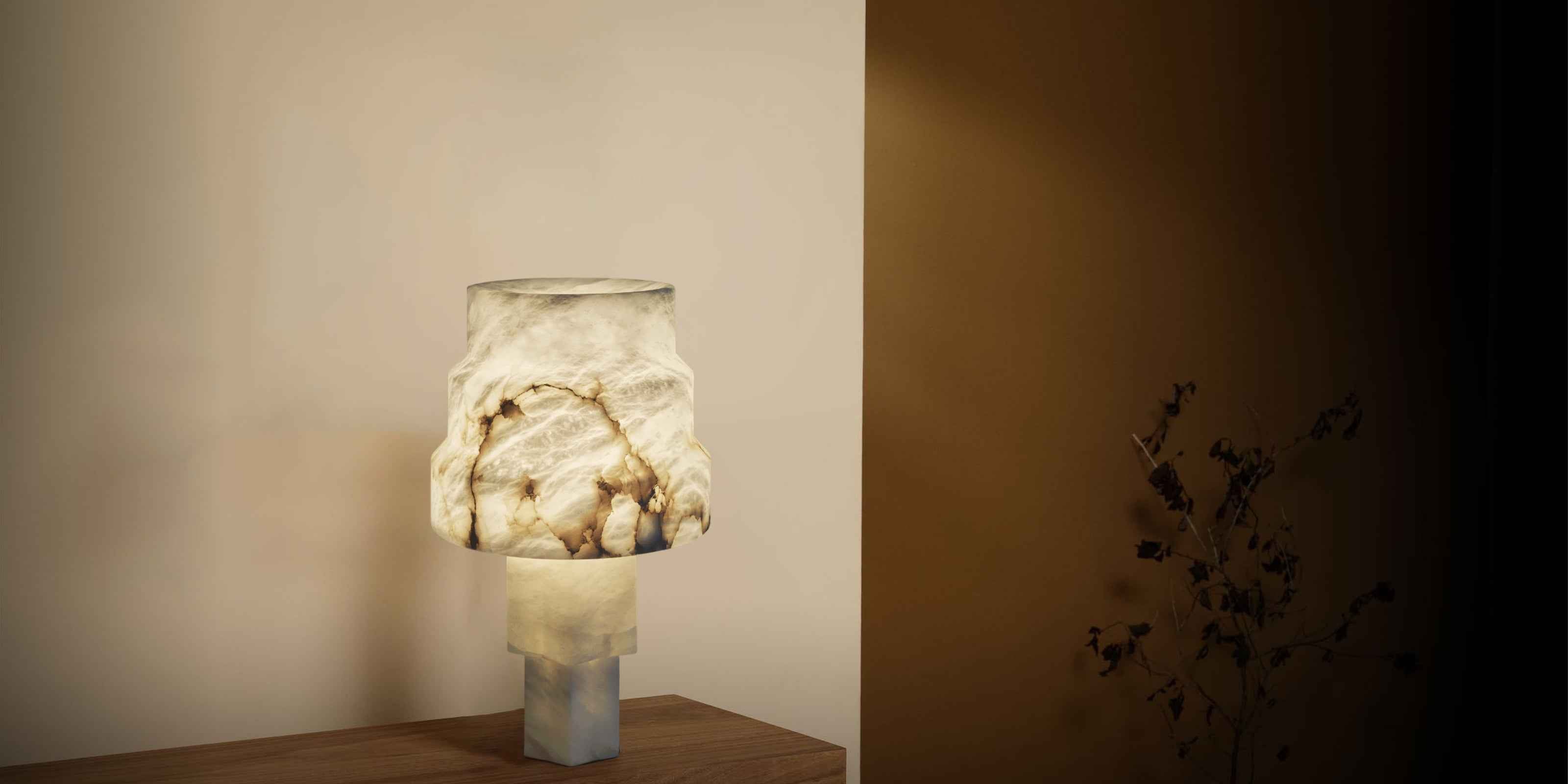 A laud to the beauty of natural stone, its features a pillar of natural alabaster rises in stacked sections to form a uniform base and shade.