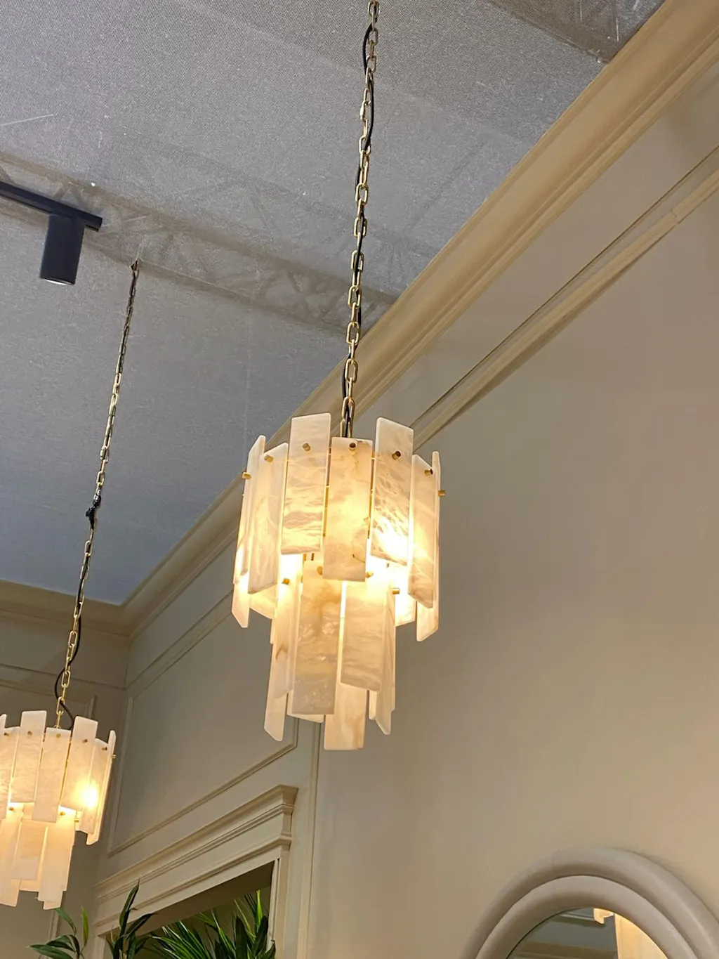 Embrace the captivating glow of the alabaster chandelier, as it illuminates your surroundings with a harmonious blend of vintage allure and the enchantment of alabaster.