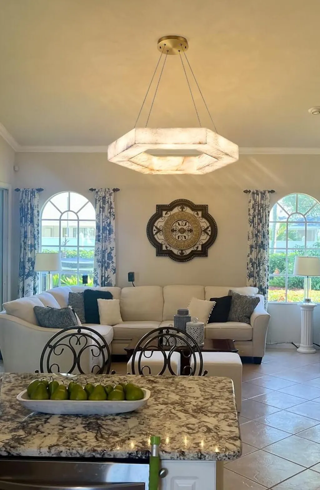 This two-tier pendant features a textured marble panel and looks fantastic in Hallways, Livingroom and Bedrooms.