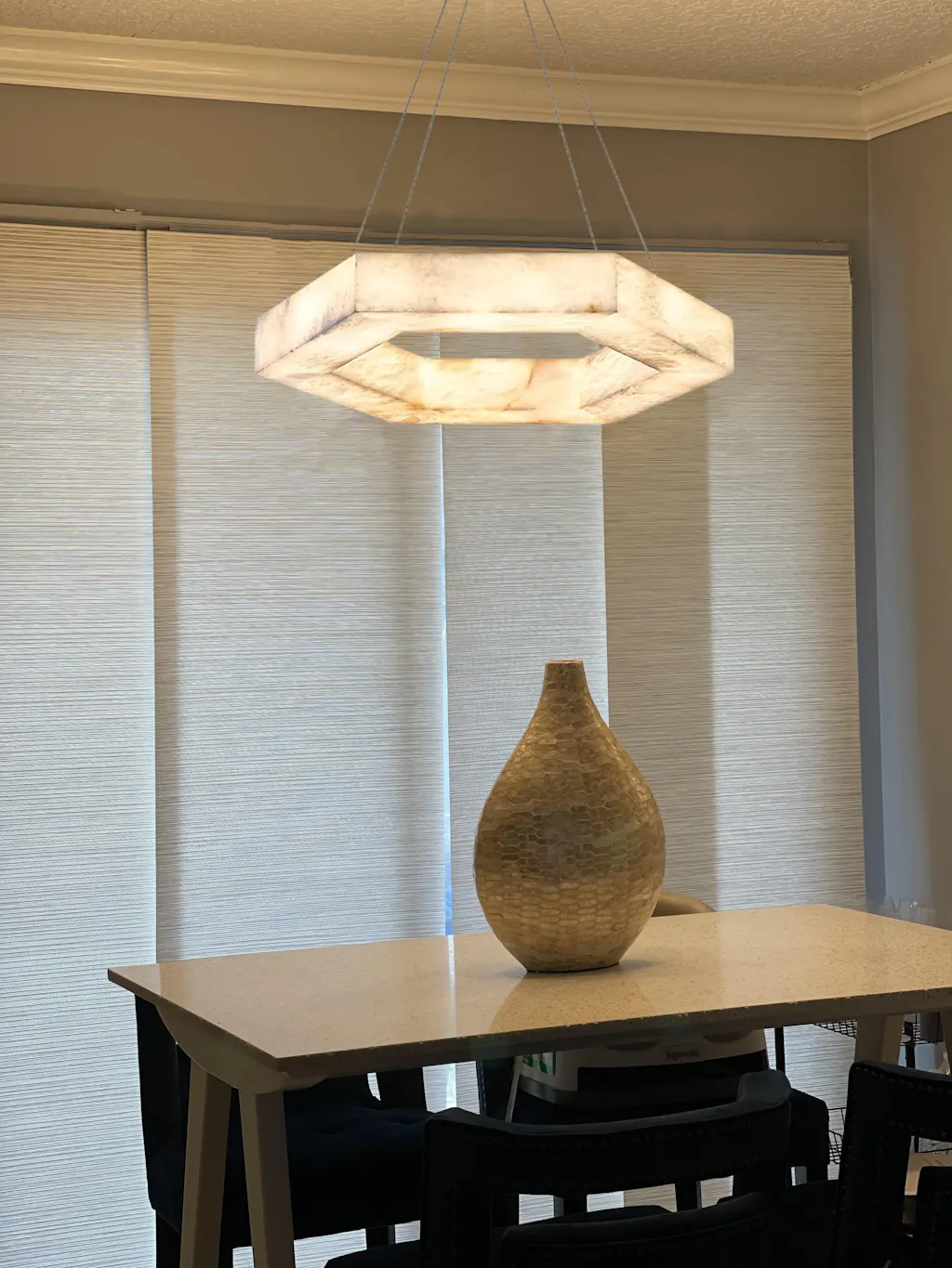 Add a note of rustic refinement to your living space with our alabaster Collection. This chandelier supports a statement with double or triple tiers of solid alabaster tiles and fine metal detailing. Whether illuminated or not, the natural stone material lends a sense of warm and earthy elegance.