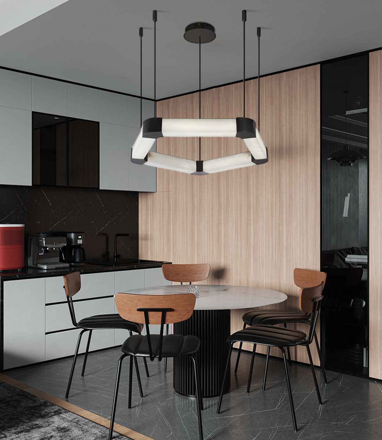 LightsStory Series Geometric Pendant Light | Pentagonal Linear Spanish Marble and Polished Stainless Steel, Polished Stainless Steel for Dining Rooms, Lobbies, and Offices