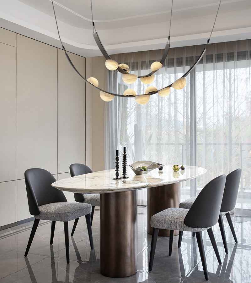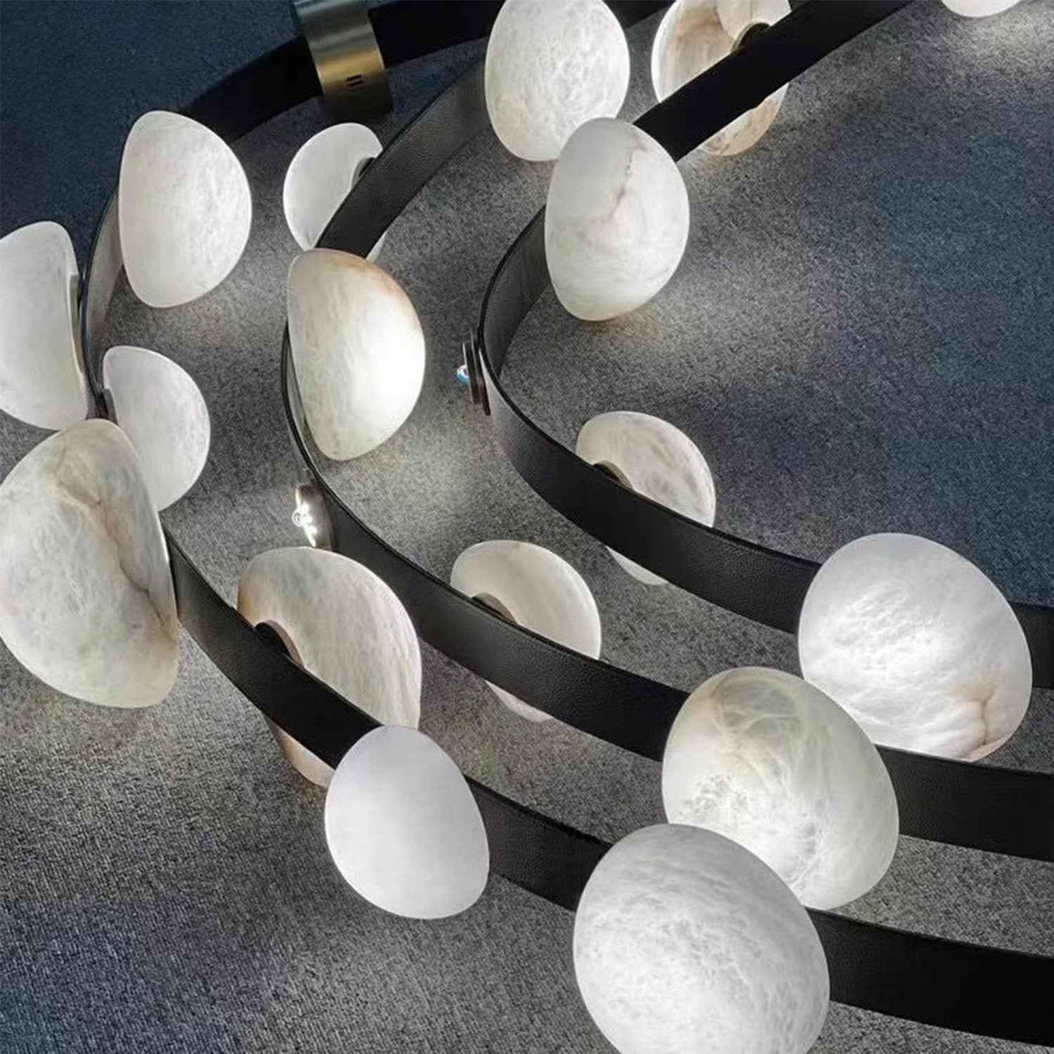 The semi-oval marble with different diameter, are attached to the same black belt, with a unique design and warm and comfortable light color, bringing infinite warmth to our home.