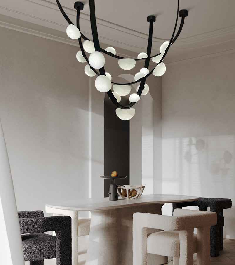 Capture the natural beauty of dew drops with our Dew Drops Alabaster Chandelier. Its intricate details were inspired by the familiar, yet captivating shape of dew drops on blades of grass, adding a touch of fascination to any space. Each piece is a stunning work of nature's art.
