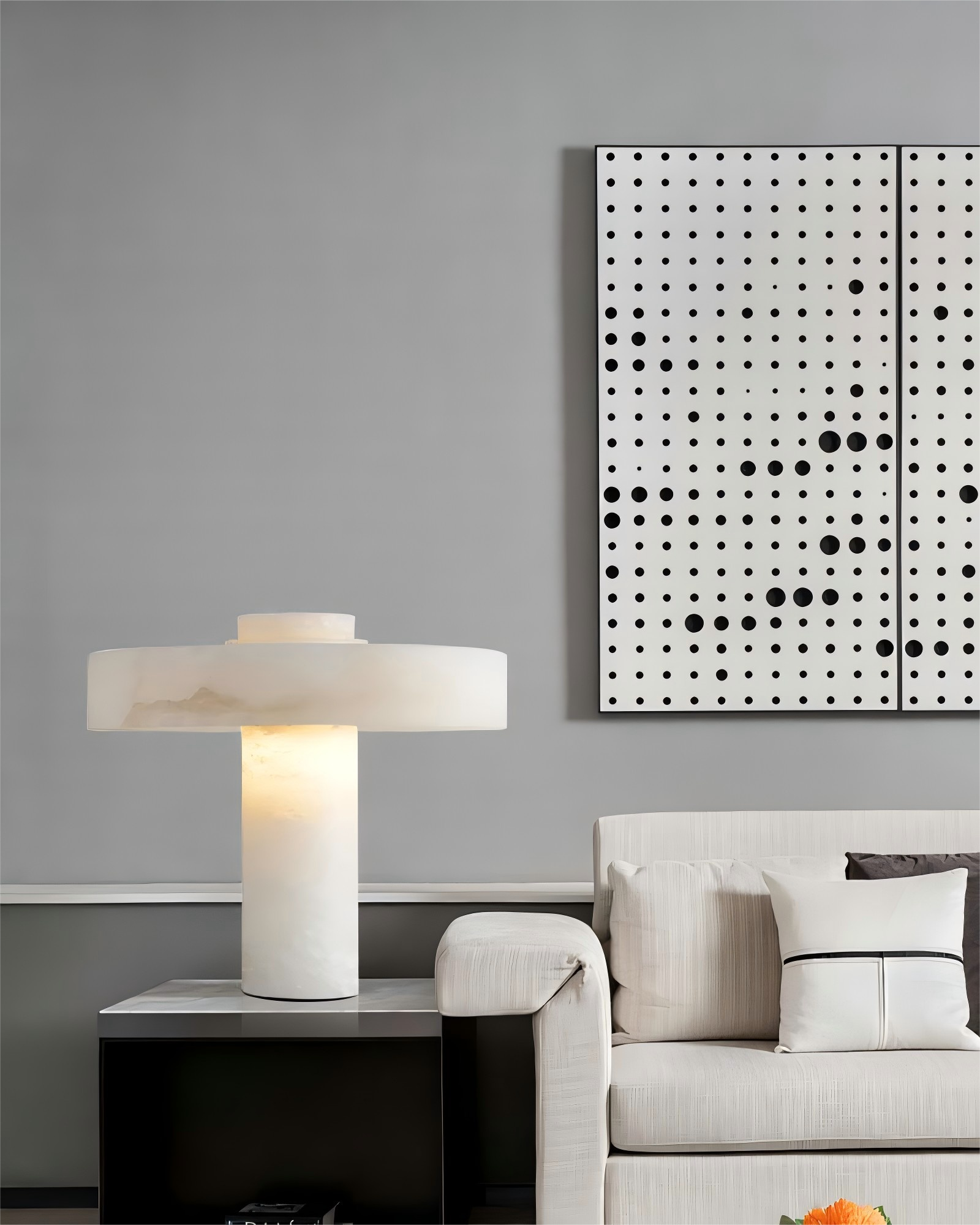 This Alabaster Floor Lamp, stones are meticulously stacked to evoke the harmony and timelessness of ancient totems, creating a sense of balance and continuity. When illuminated from within, the alabaster stones emit a warm, diffused light that accentuates their natural elegance.