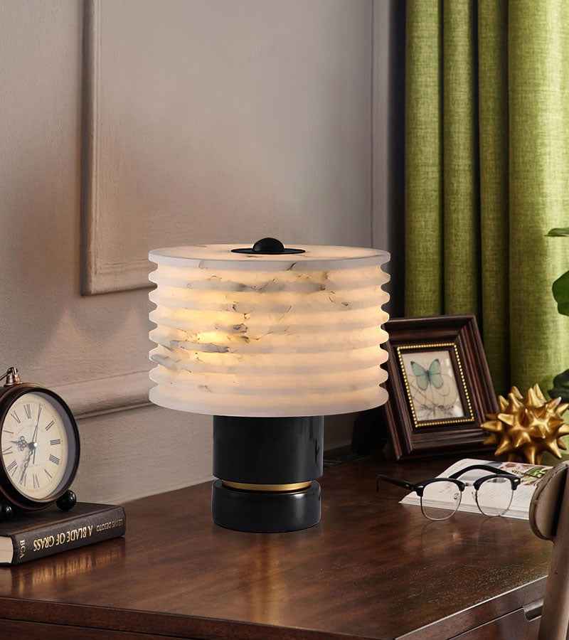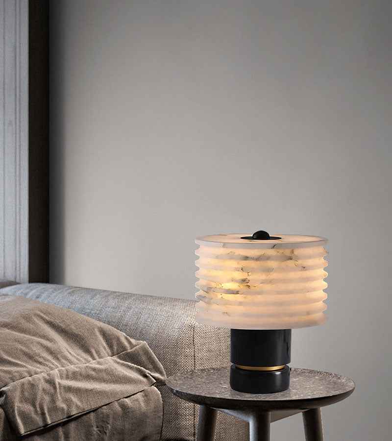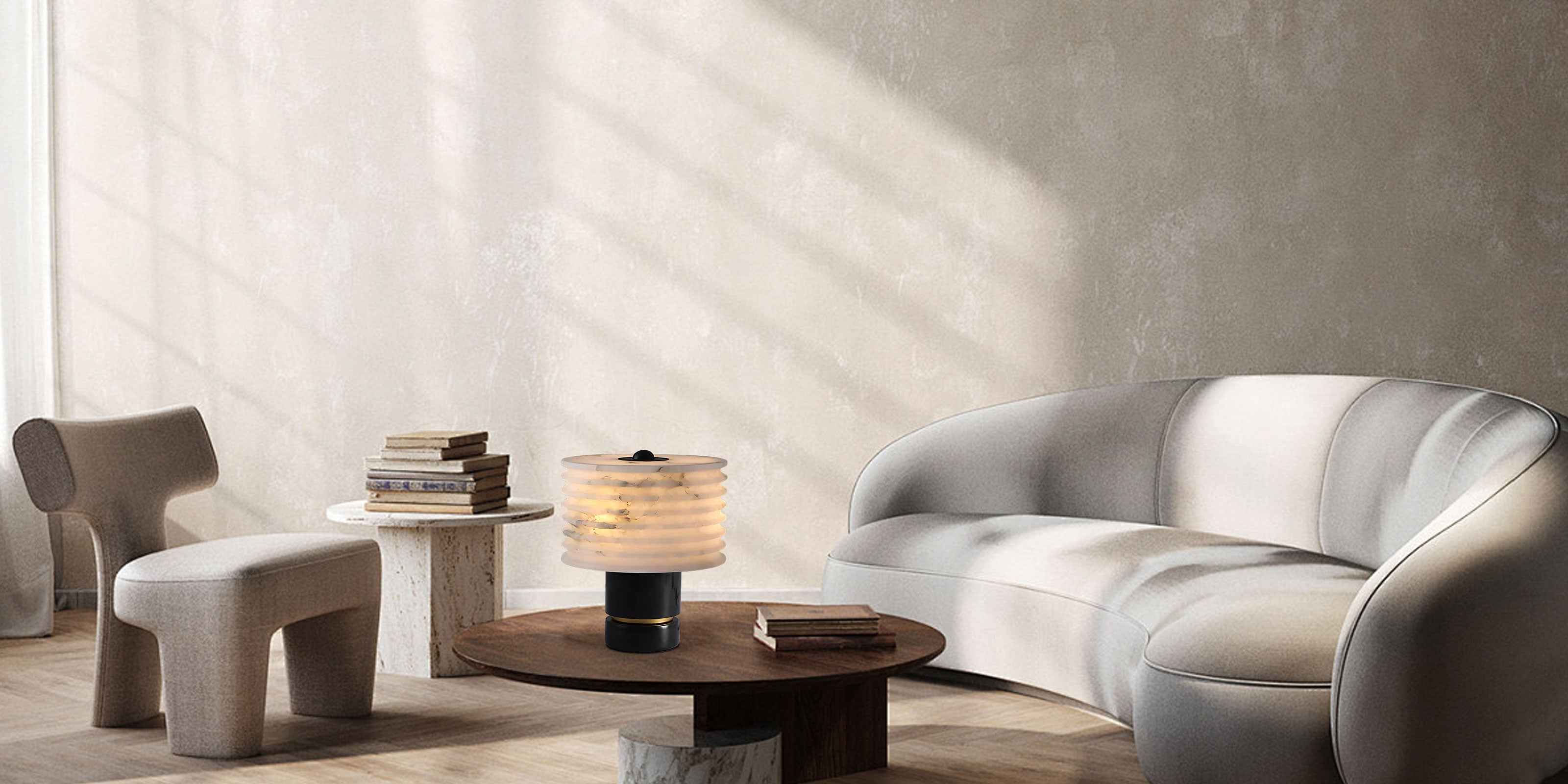 Sculpted from alabaster, the mini marble table lamp has a soft radiance that sets the mood in spaces. The clean geometric lines give shape to the stone’s natural free-flowing patterns, while its narrow rim concentrates diffused light.