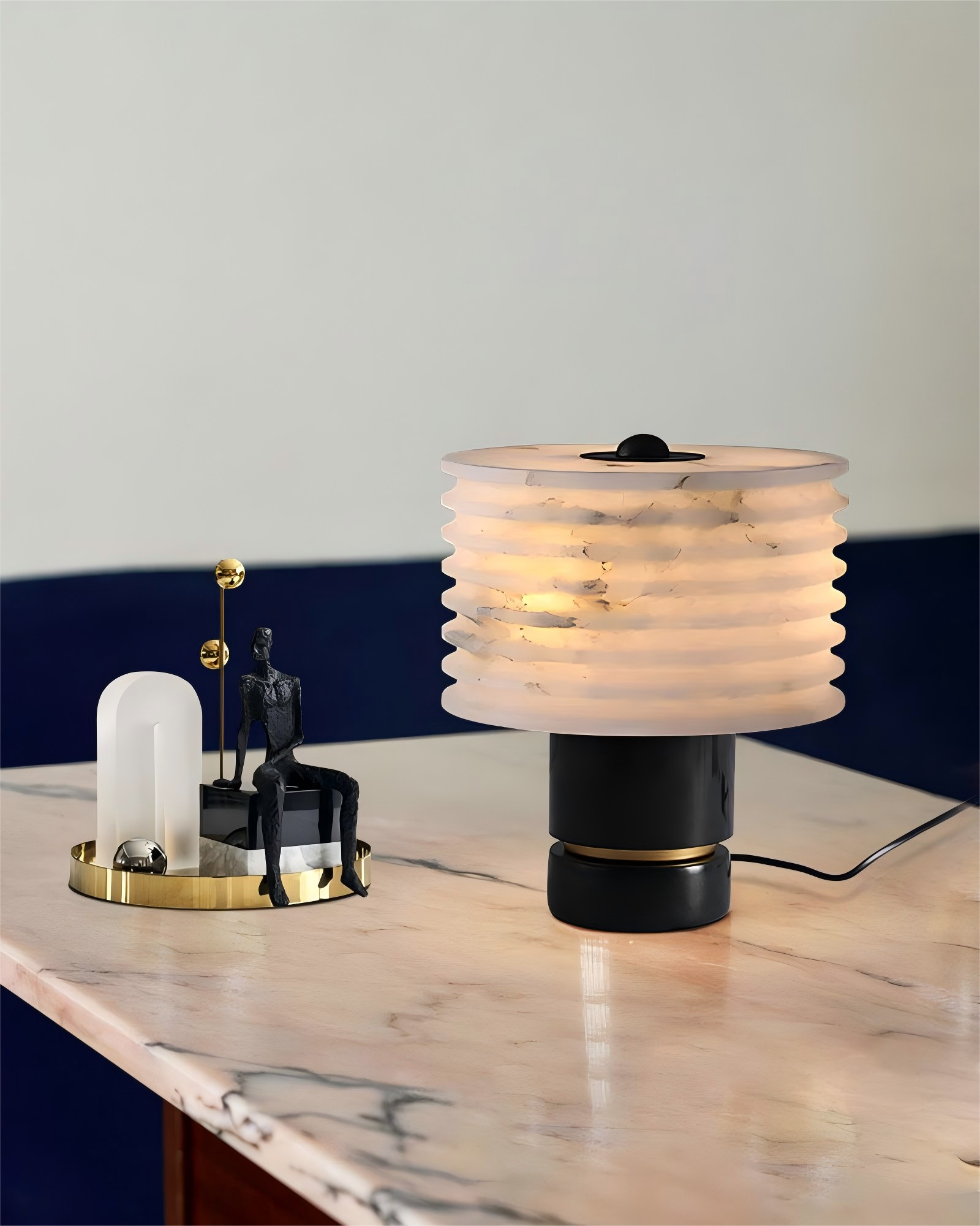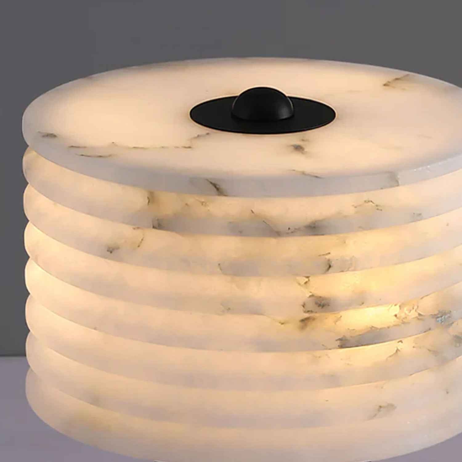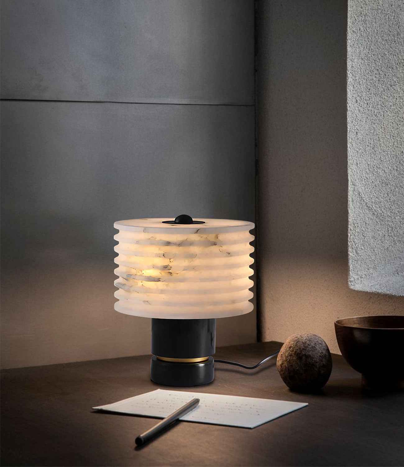 Sculpted from alabaster, the mini marble table lamp has a soft radiance that sets the mood in spaces. The clean geometric lines give shape to the stone’s natural free-flowing patterns, while its narrow rim concentrates diffused light.