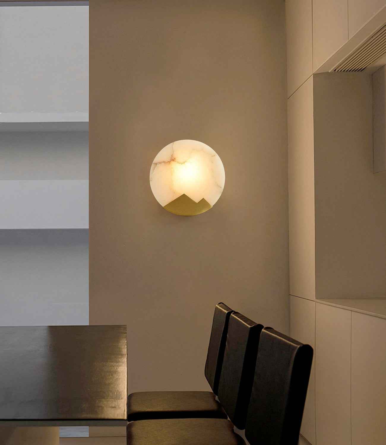 Classy marble stone, brushed brass frame and lamp holder, this wall light emanates elegance and warmth. The creative yet simple design has the LED lights shines through the transmitting marble stone, lighting up the space around it softly and elegantly, ideal for living room, bedroom, dining area and hallway lighting.