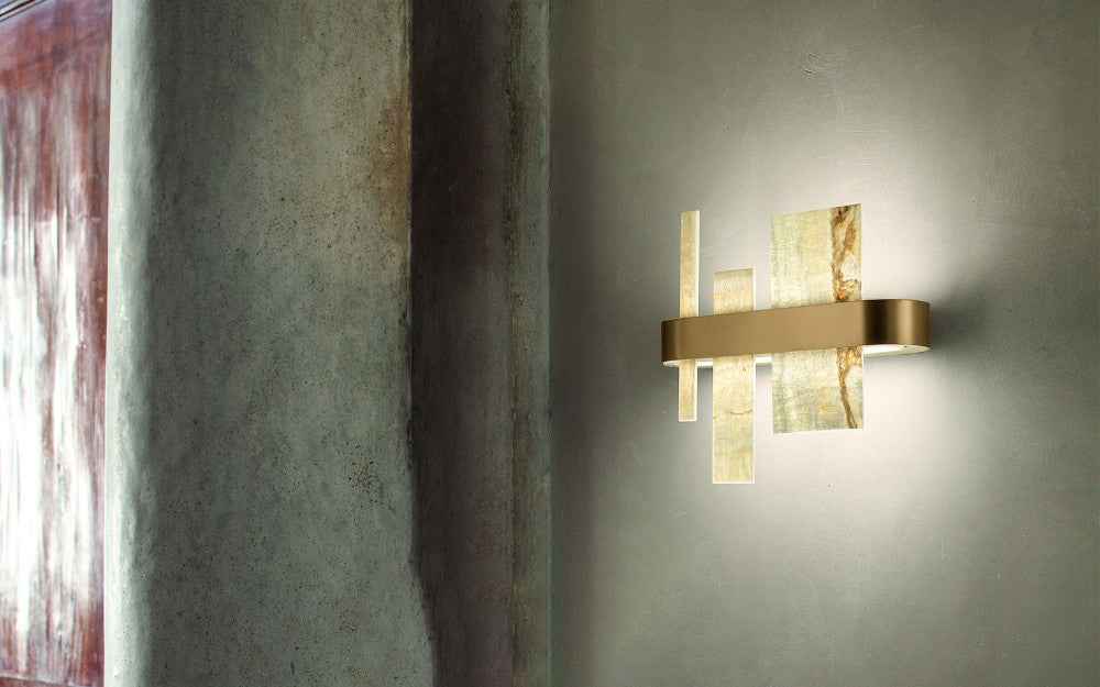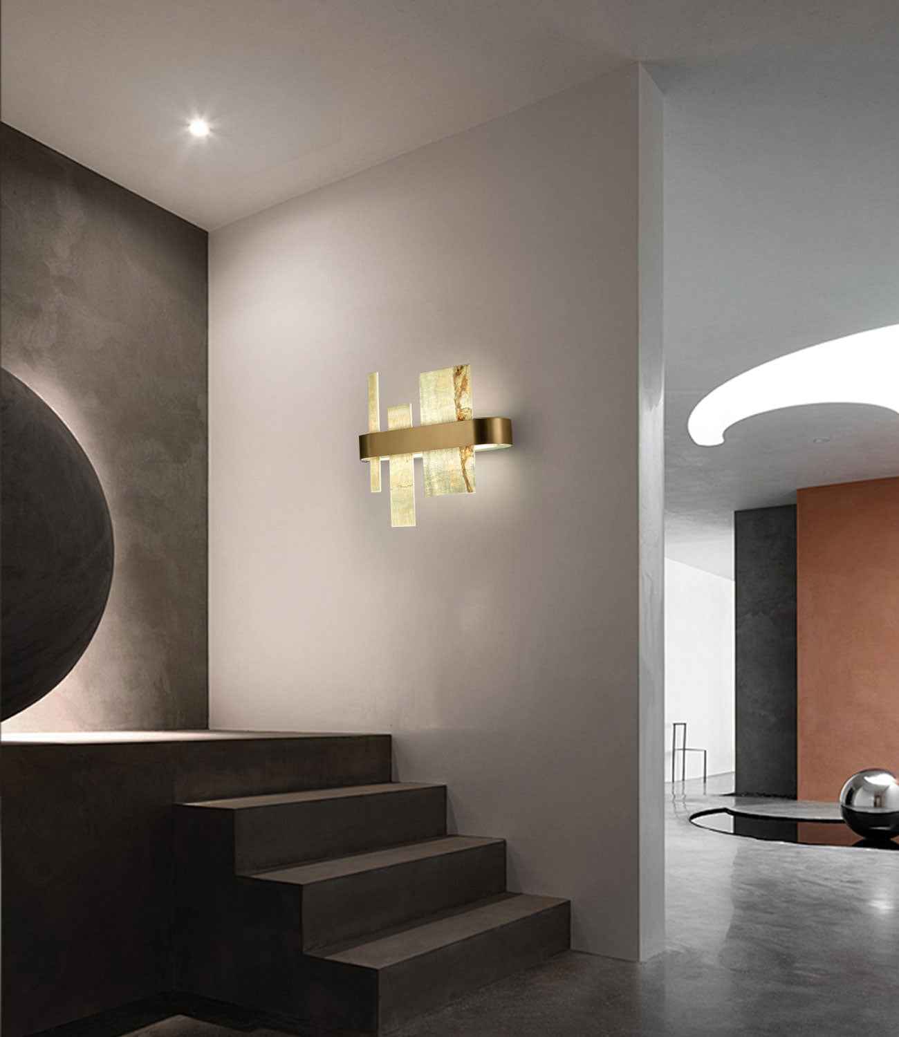 LightsStory Series Geometric Wall Sconce | Natural Marble Slice Natural marble slices with sleek copper and stainless steel frame, Copper and Stainless Steel finish for Dining rooms, foyers, or bedrooms by LightsStory.