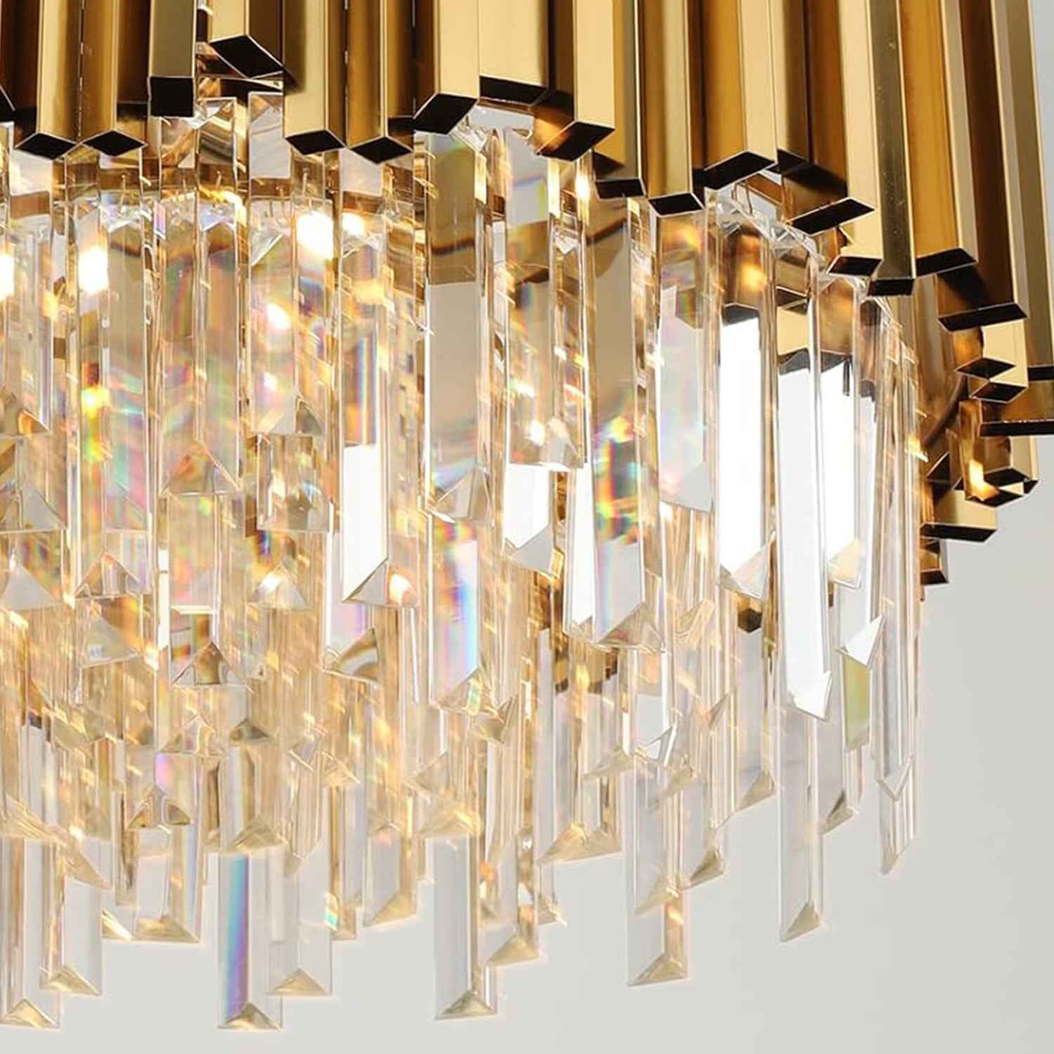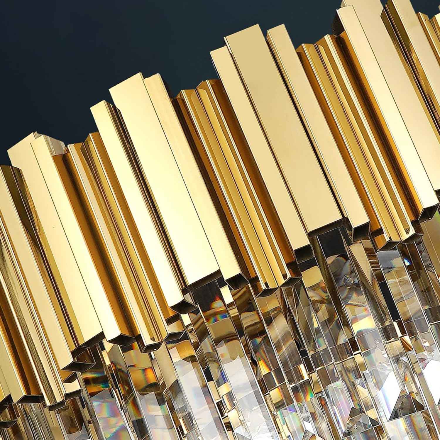 Elevate your space with our modern gold crystal chandelier. The gold wall lamp features a clear crystal lampshade which is formed from different length shiny crystal glass rods, combines brushed brass finished lightweight aluminum light base, bright but not dazzling.