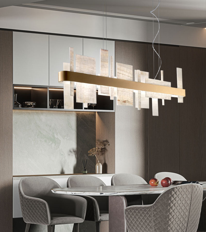 This series (within chandeliers & wall sconce lamp) features with rectangular natural cloud stone diffusers of different sizes. They are vertically and horizontally attached to a square stainless-steel frame with golden finish.
