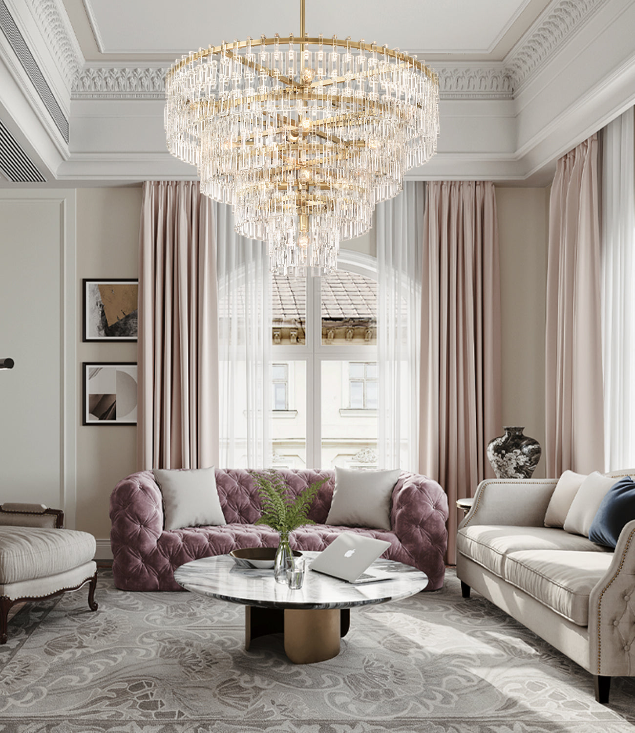 Multiple layers of crystal superimposed and suspended on stainless steel gold steel ring, layer by layer, very luxurious atmosphere, to our home brings shining stars.