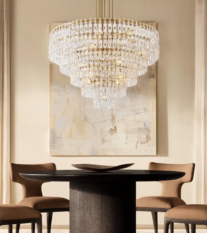 Add classic styling and elegance to your dining space in a burnished brass frame that creates a warm golden look, this chandelier is adorned with clear glass crystal rods in three/four/five tiers.