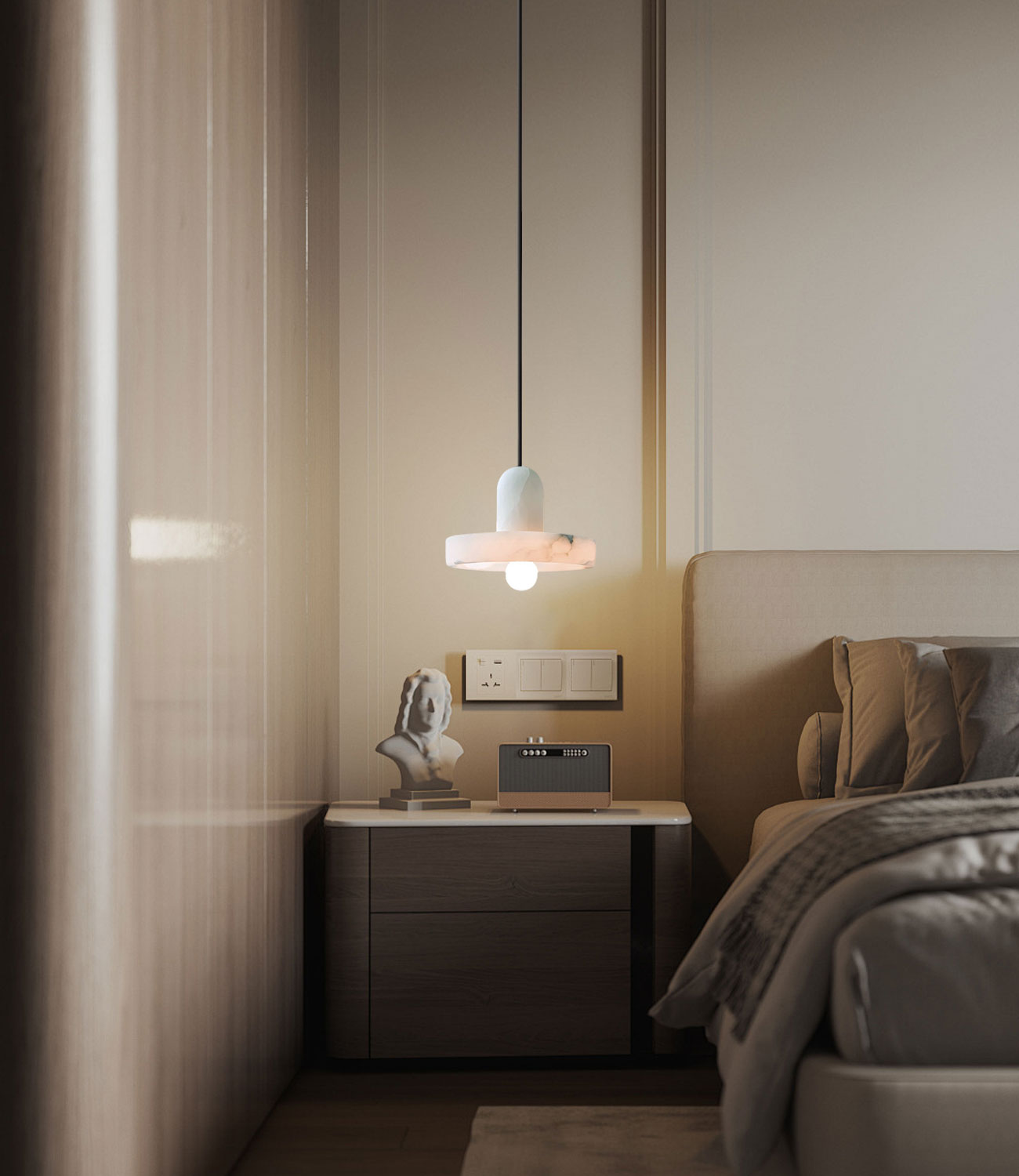 This White alabaster mini pendant lamp is made of high-class marble with high-quality copper ceiling cover. The lamp has 2 different sizes with 2 types of bulb heads and 3 types of light for you to choose from. The product is designed with a simple but no less luxurious and high-class style that will help increase the aesthetics of your personal decoration space.