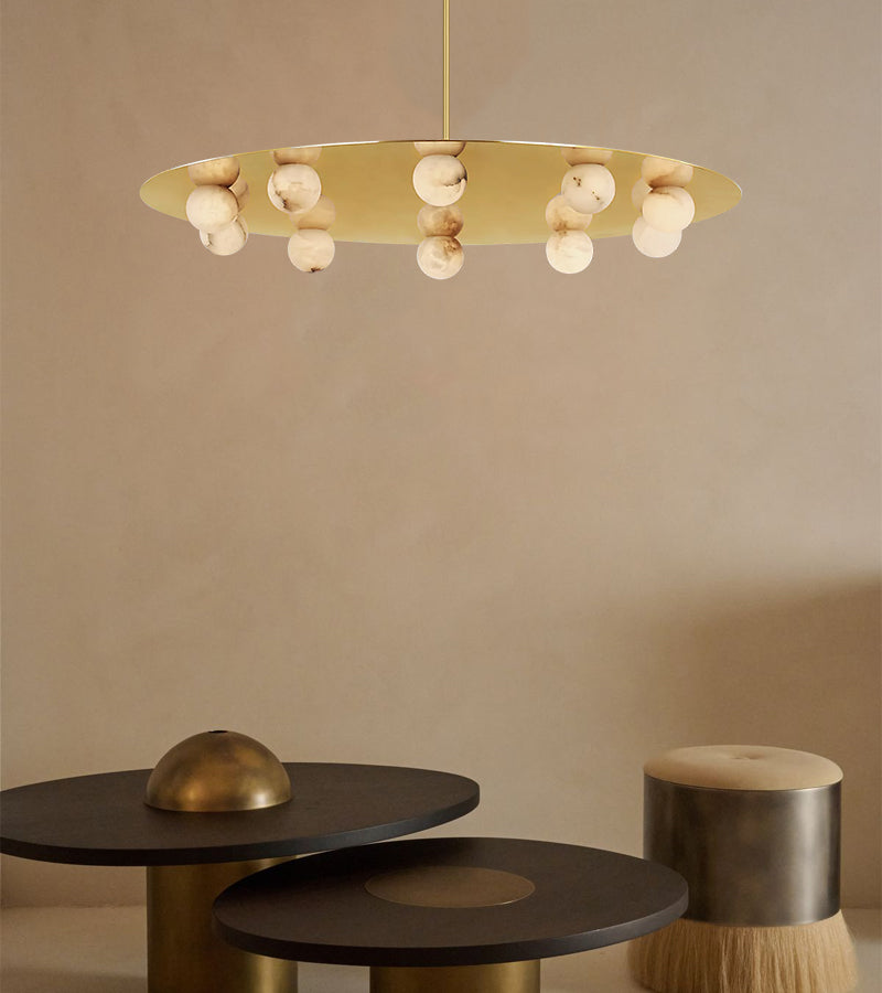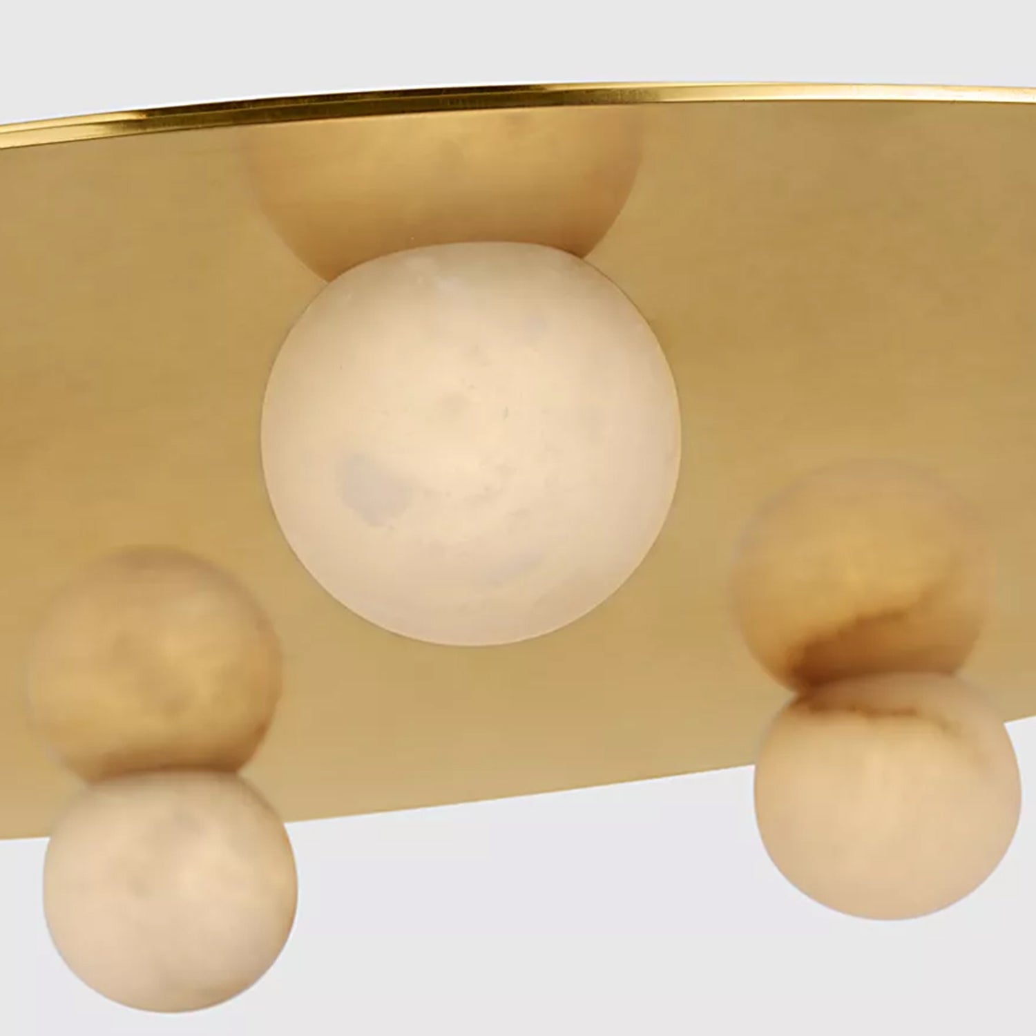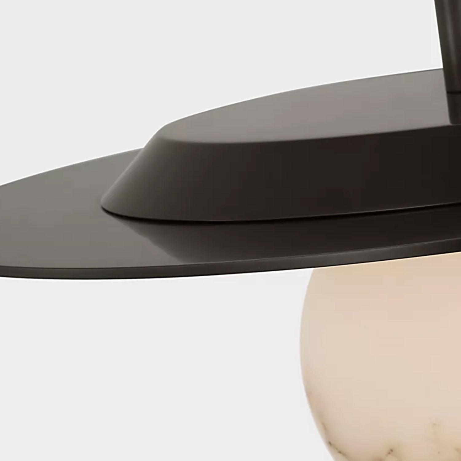 Modern minimalist design with a sleek, slim brass disc frame to provides soft, glare-free illumination through an alabaster globe shade.