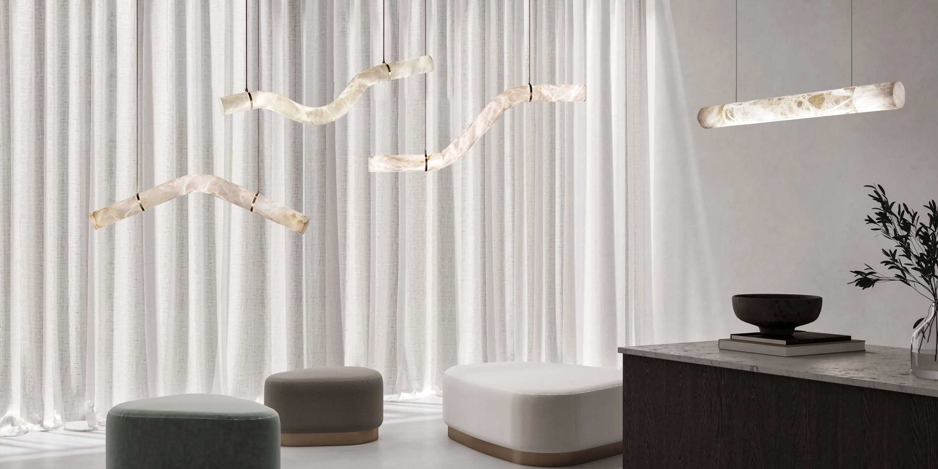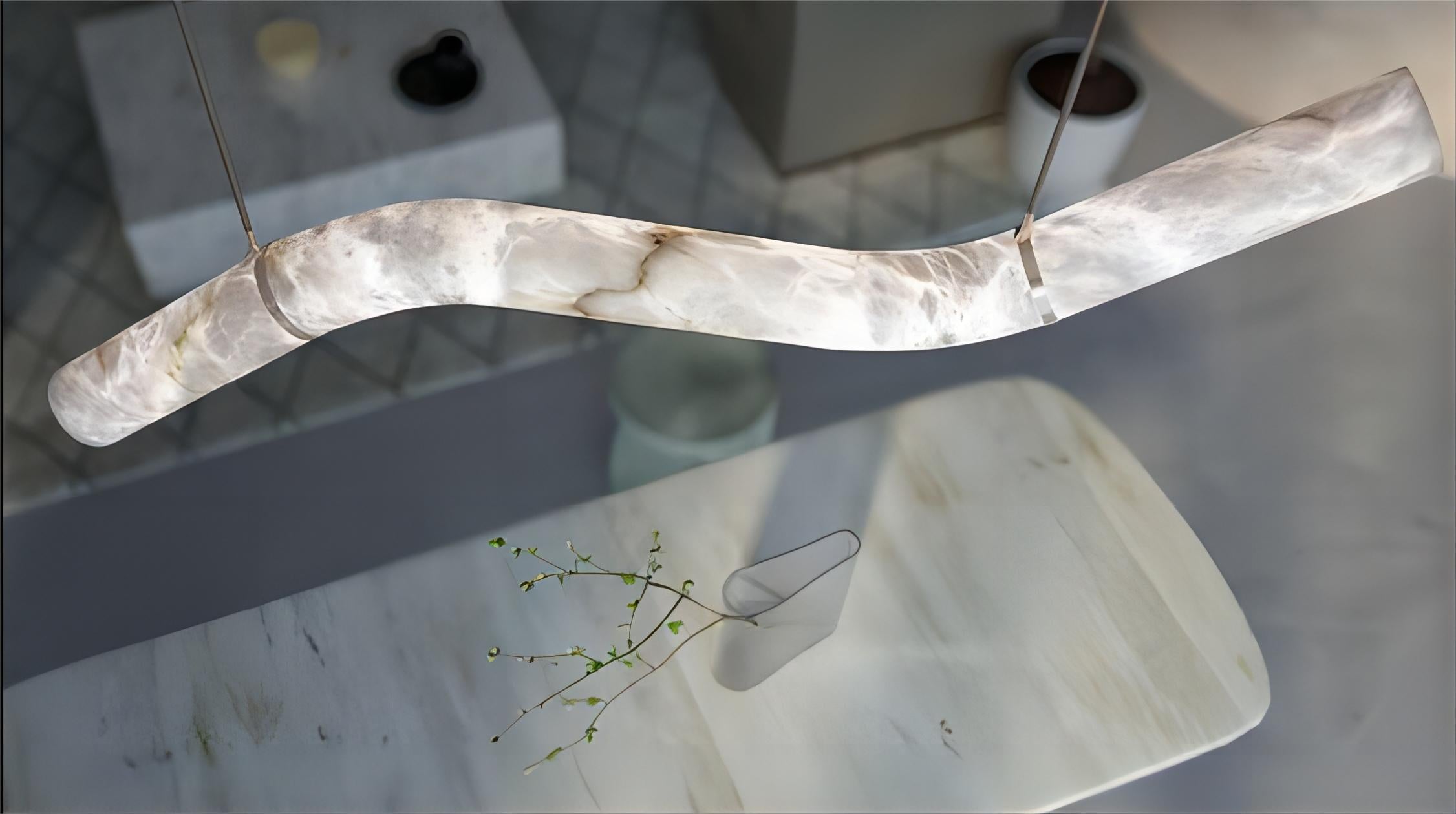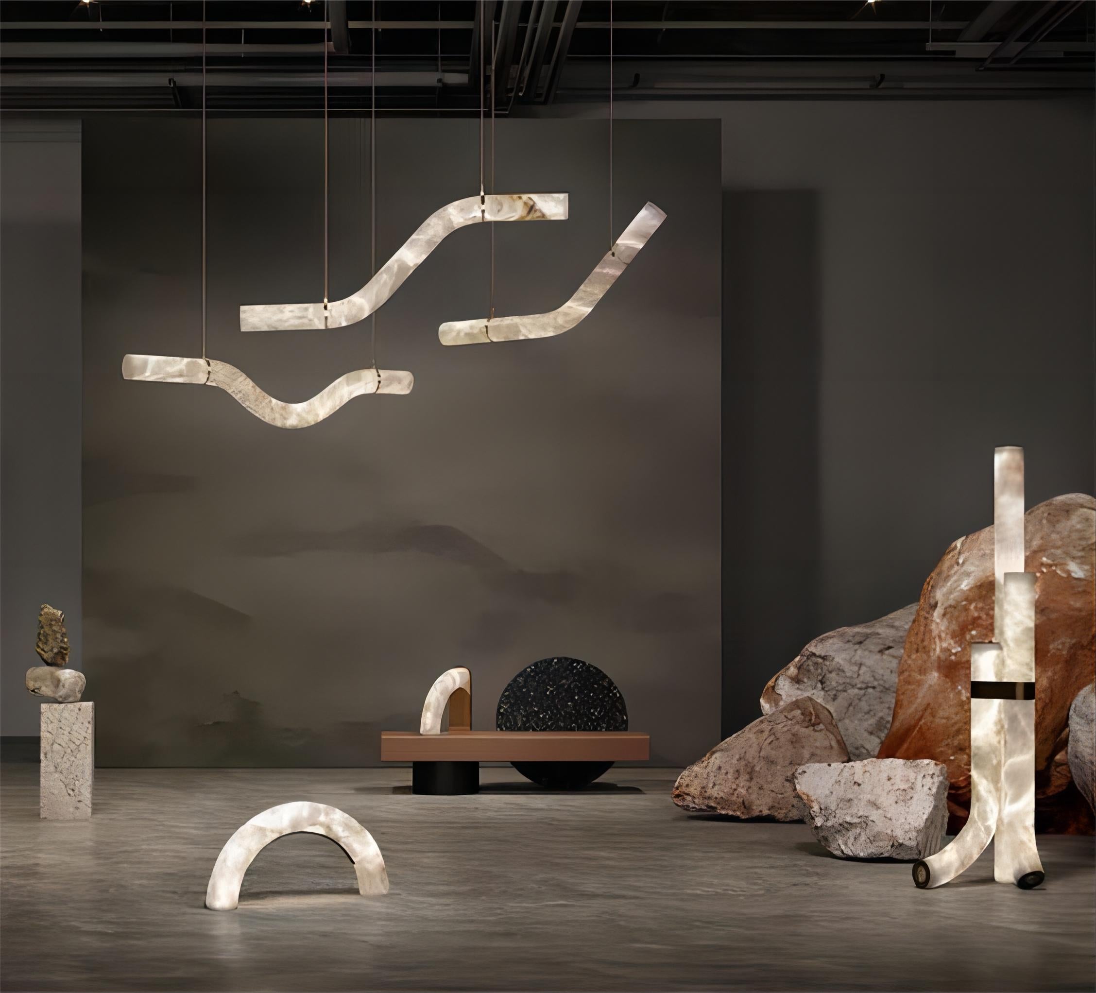 An exploration of balance and expressive sculpture, this series alabaster chandeliers focus in any environment. Consisting of a closed loop structure, the sinuous form nods to the mathematical symbol for infinity and the never-ending flow of light through time and space.