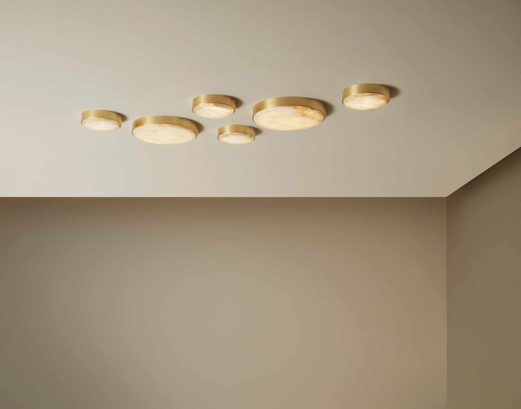 Discover the Anvers Collection, where minimalist design harmonizes with nature's artistry. Defined by a refined, low-profile silhouette, this lighting series features a handcrafted disc of translucent natural alabaster stone, expertly honed to diffuse a soft, ambient glow.