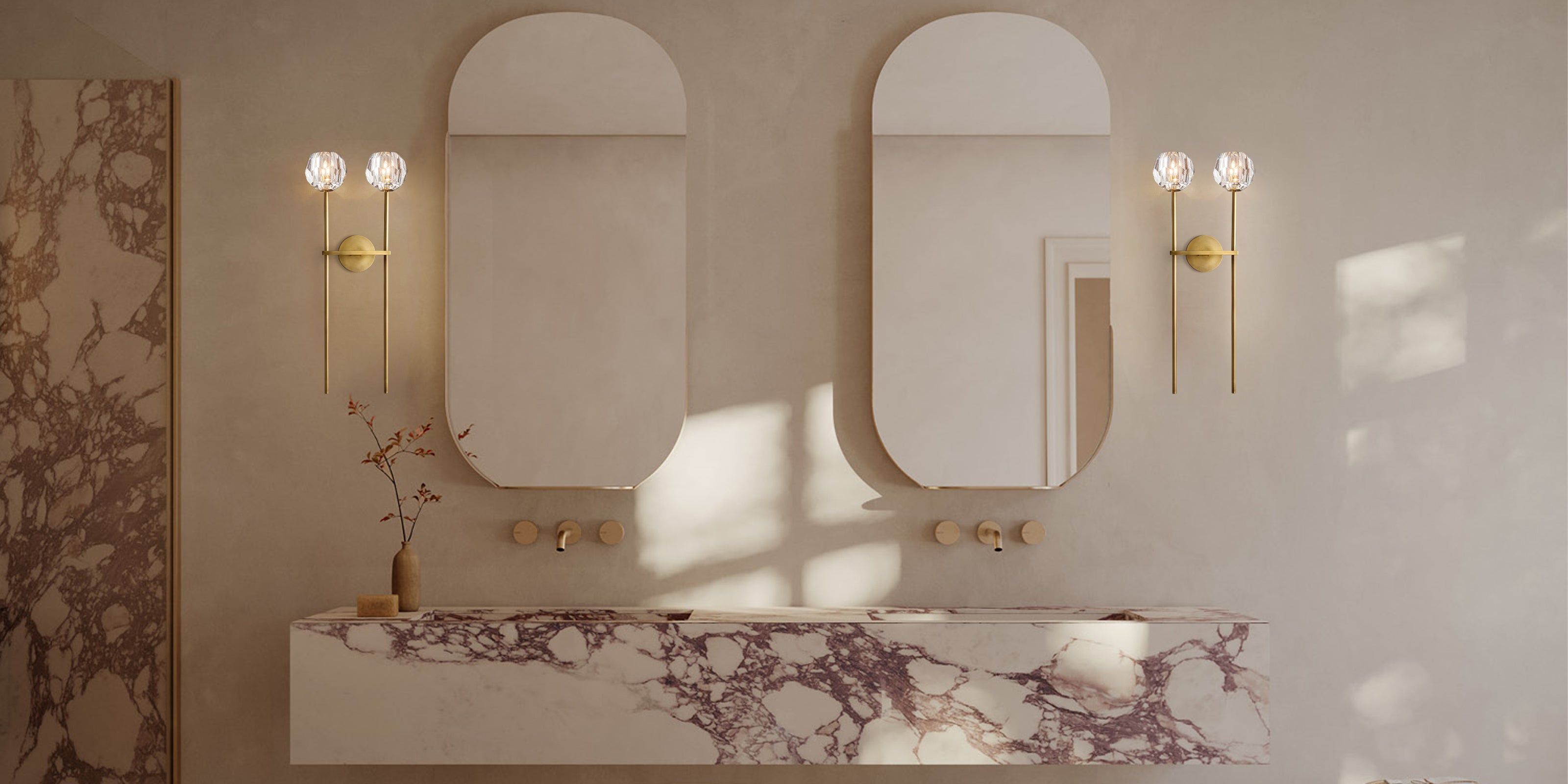 2-Light Modern Crystal Wall Lamp Black/Brass Height 2" For Bathroom