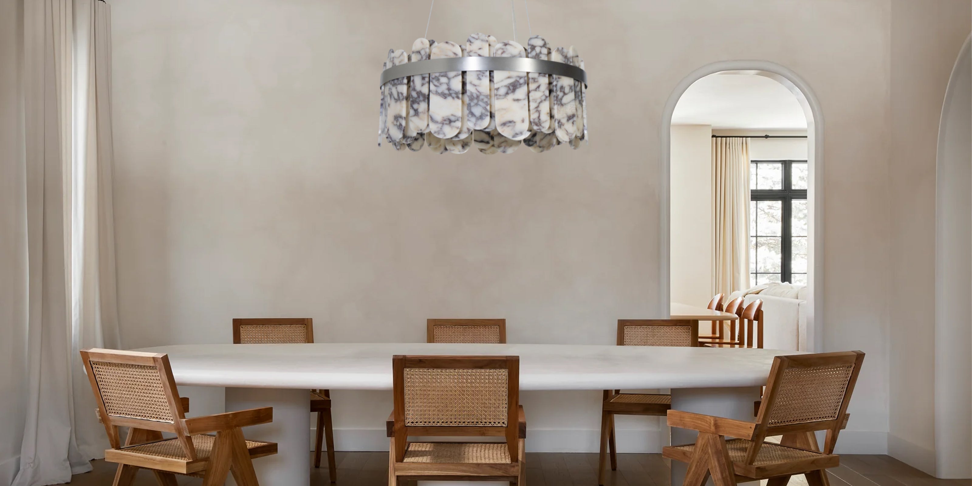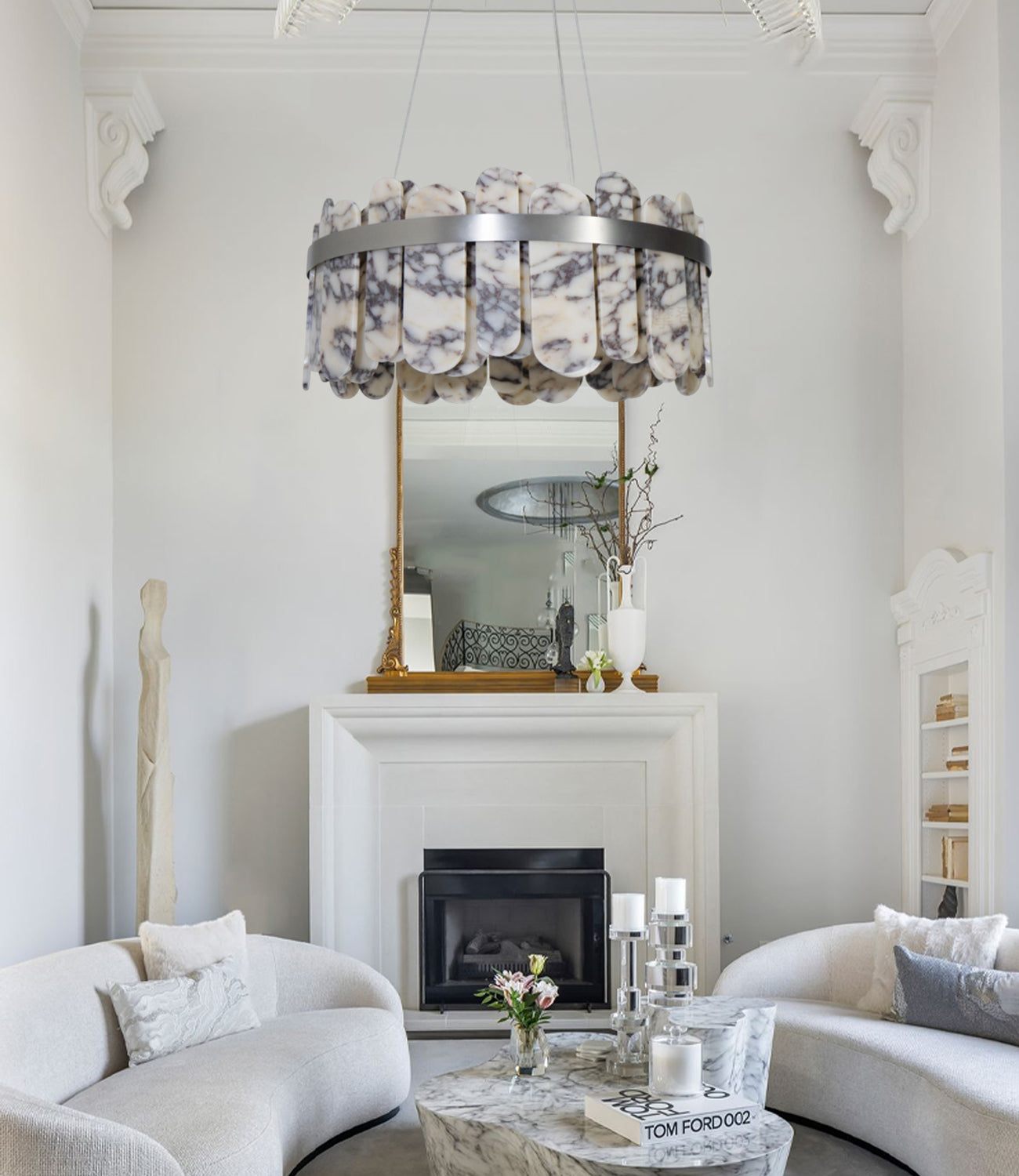 This modern chandelier features an elegant marble design that perfectly combines simplicity and luxury, adding a touch of chic to your living room.