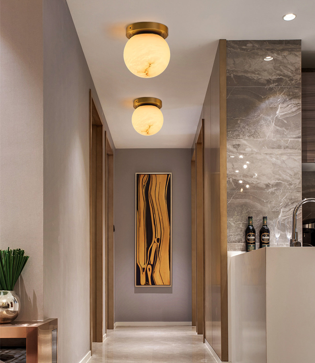 - Sleek semi-flush silhouette blends round alabaster orb + square brass frame.