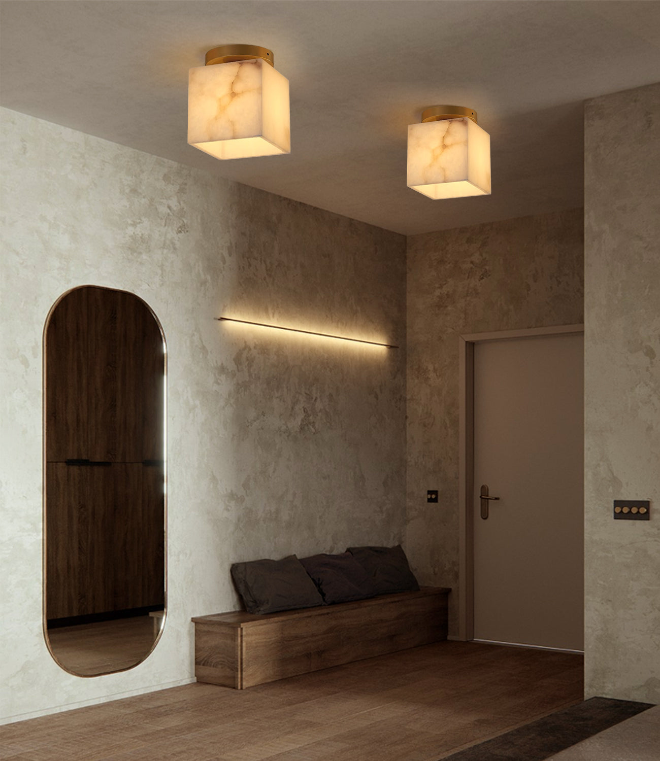 Enhance your home with the minimalist elegance of the Alabaster Ceiling Light. This sleek semi-flush feature a solid alabaster cube that emits a warm, ambient glow, perfect for modern interiors. Each piece is handcrafted, ensuring a unique and refined touch to any room.