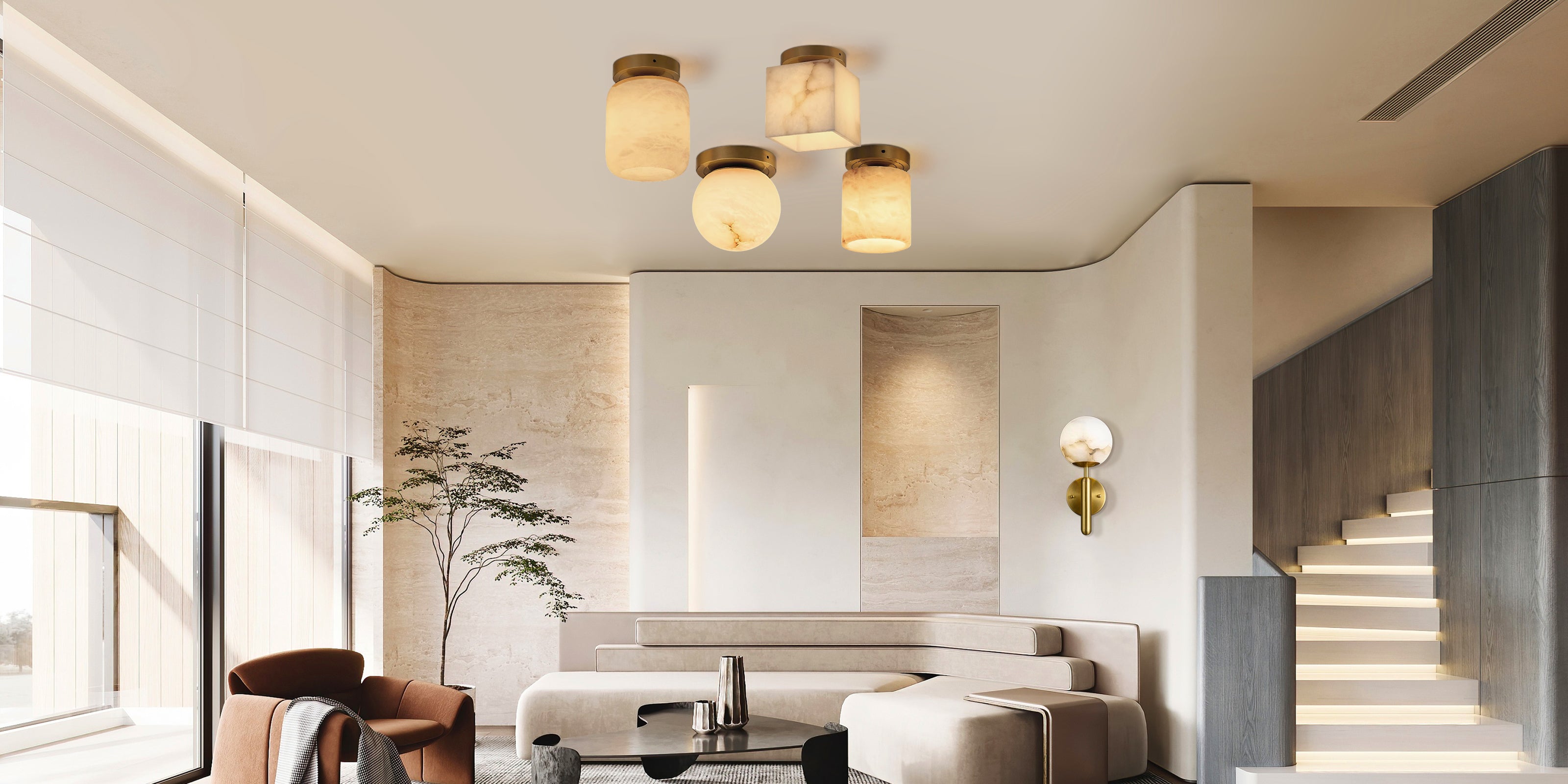 Revitalize your space with the Alabaster Melange Brass Ceiling Light. With its elegant alabaster stone and luxurious brass finishing, this flush mount light exudes understated opulence. Experience the perfect blend of refinement and functionality as this light enhances your room with a touch of sophisticated flair.