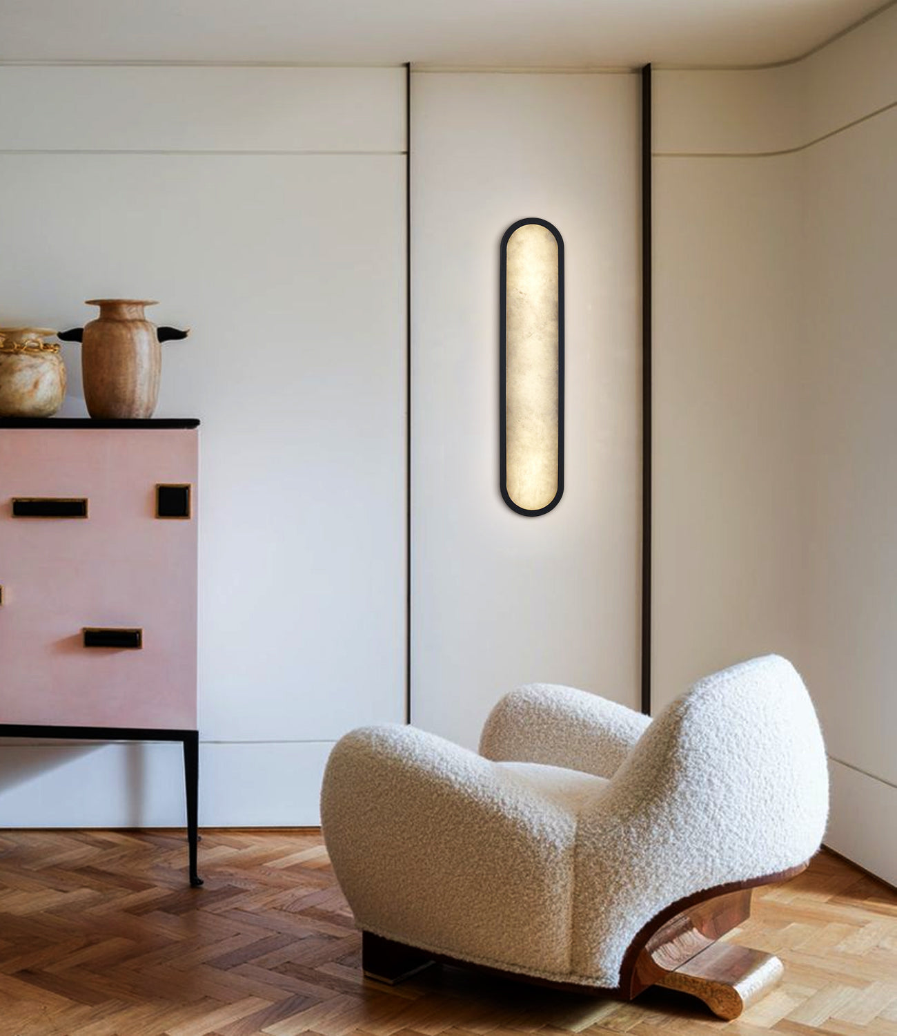 Elevate your space with our minimalist wall lamp, where modern design meets natural elegance. Featuring a sleek rectangular/oval alabaster stone shade and a sturdy iron body, this piece blends seamless functionality with artistic charm.
