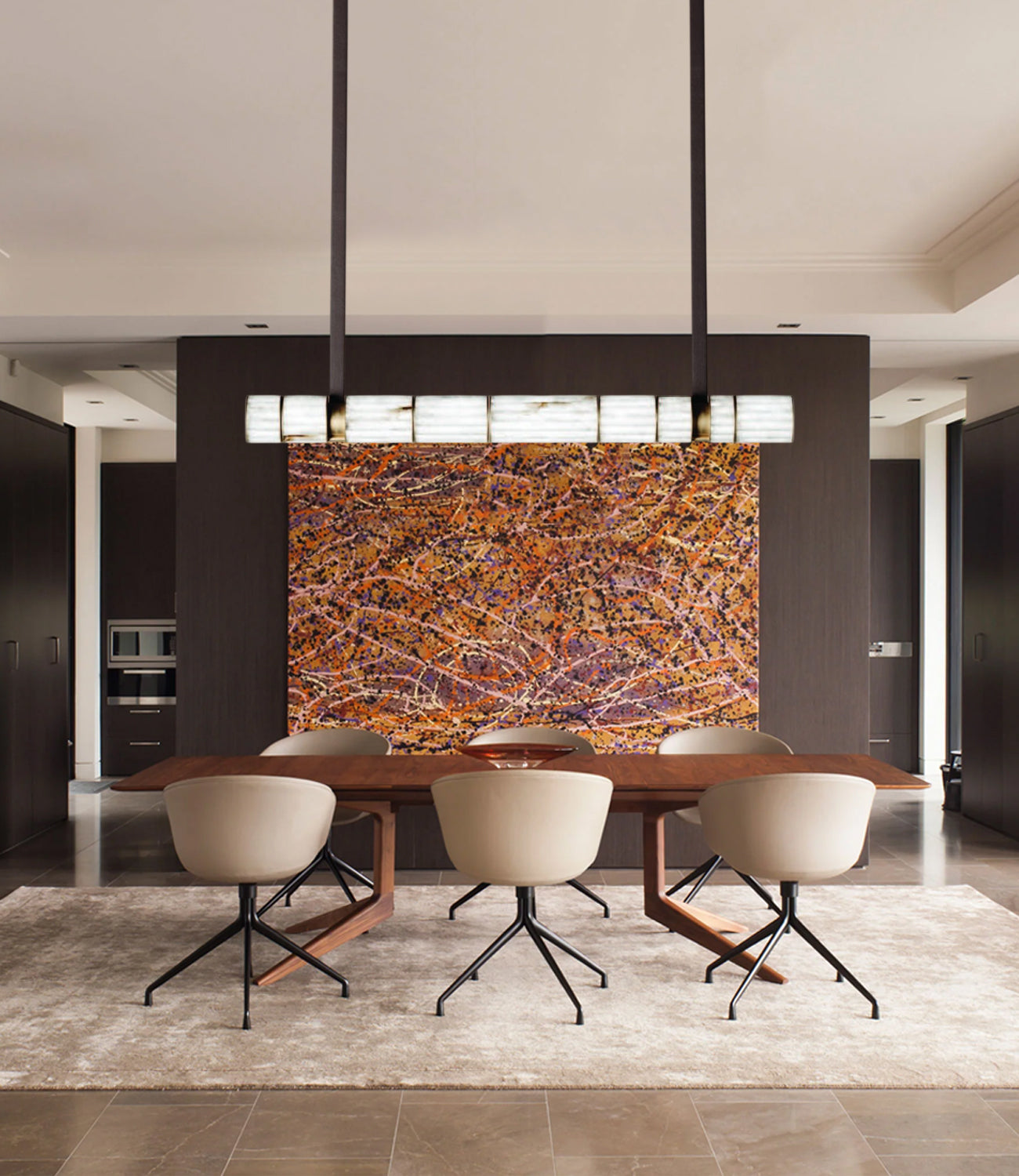 In the dining area, the long textured alabaster pendant blends with vintage-style furniture, wrapping the space in elegance,draping the corner in refined grace.
