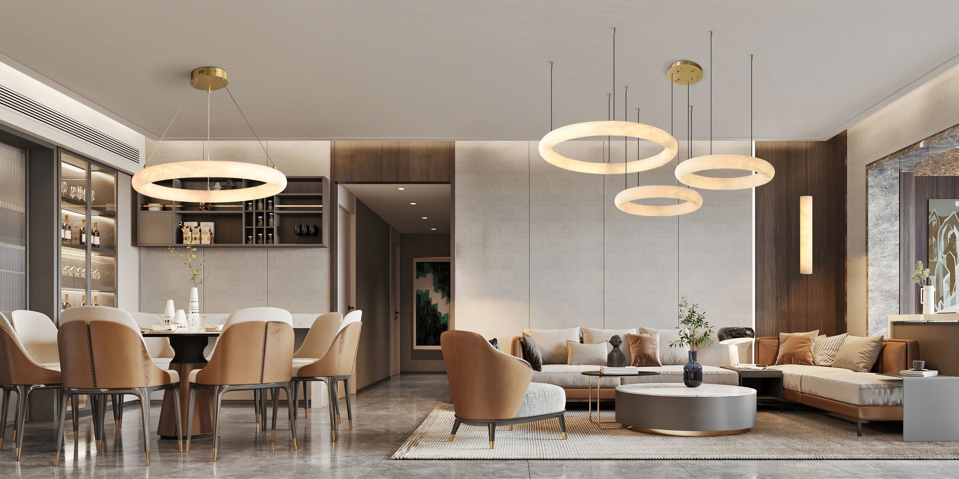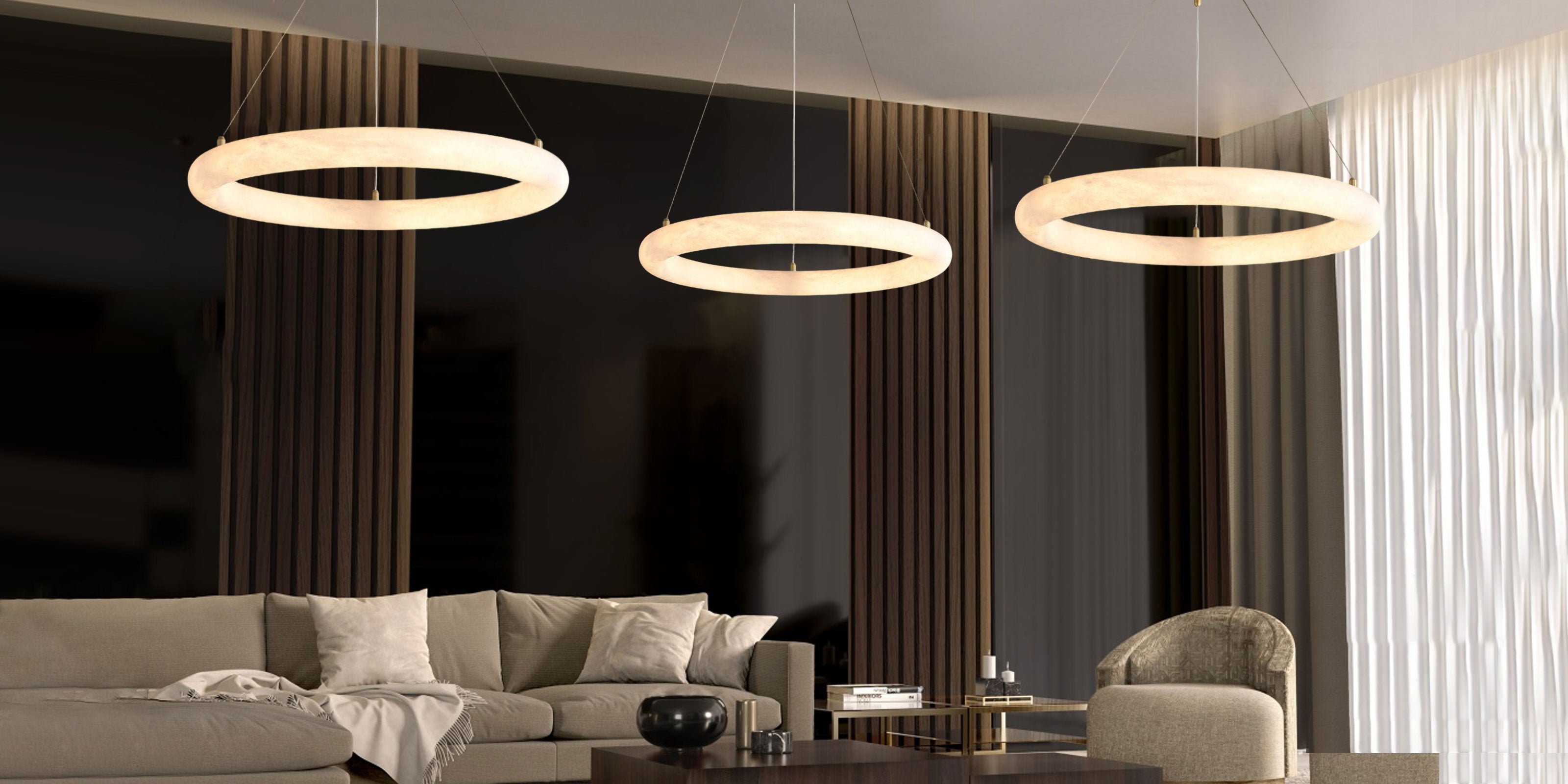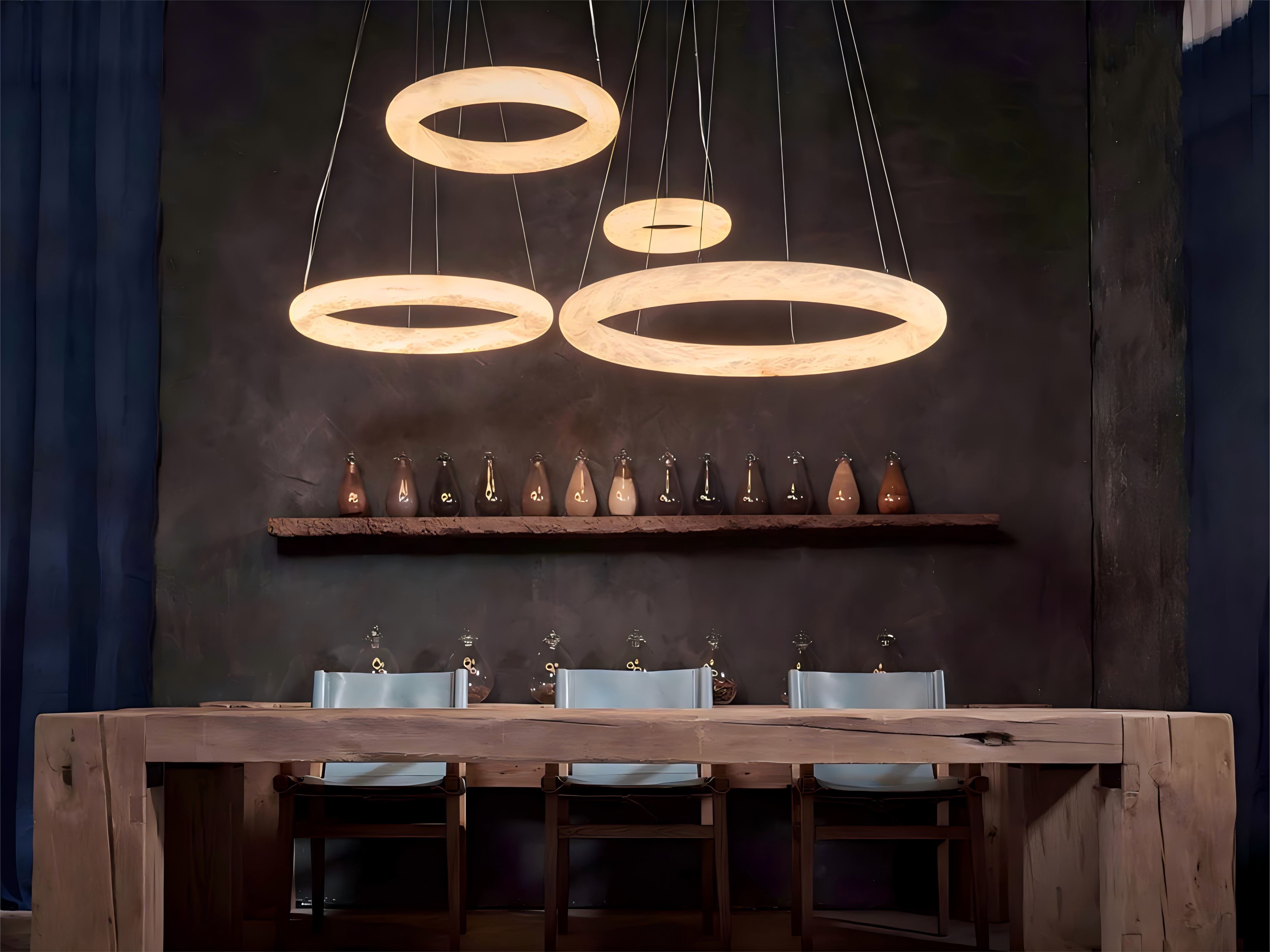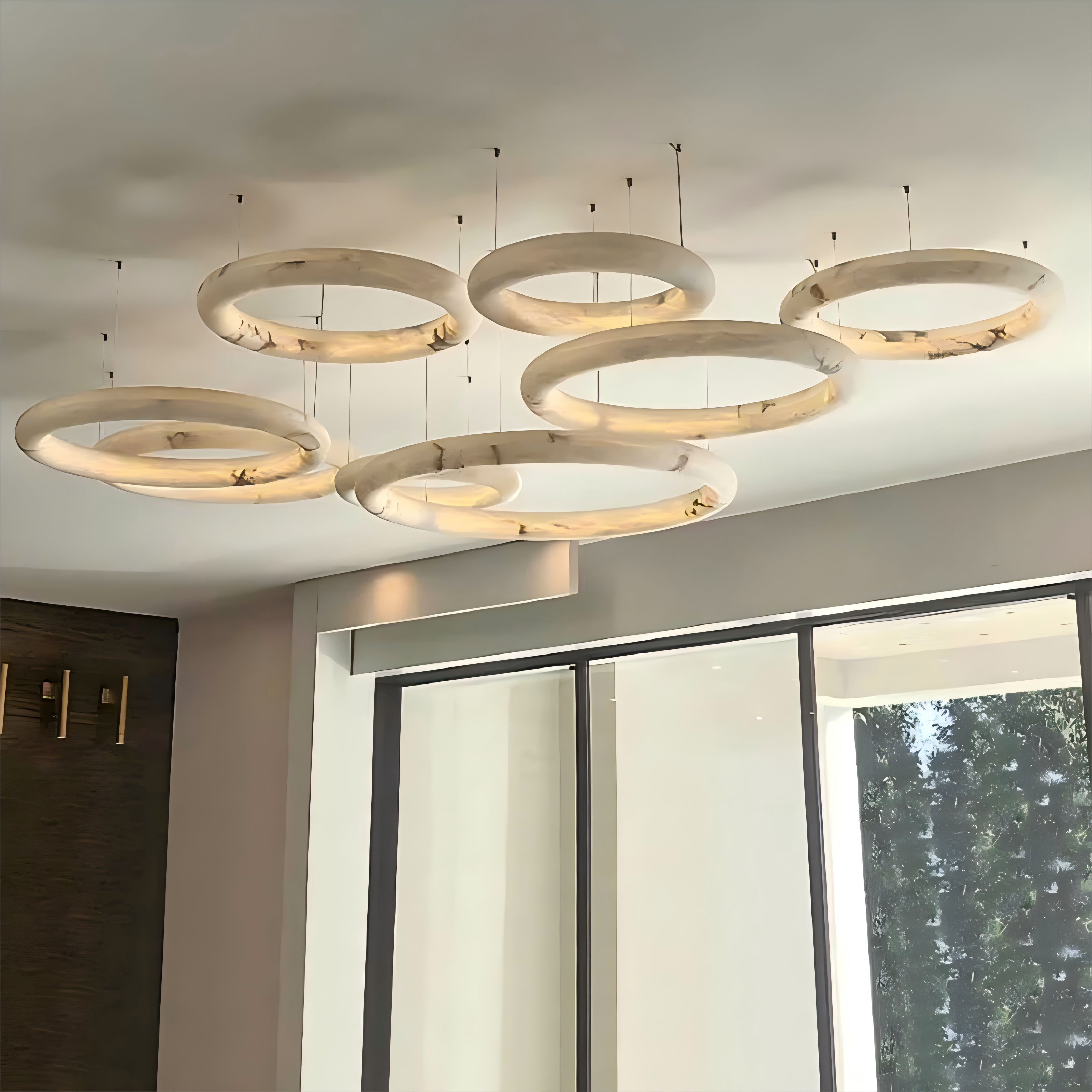 The Halo Alabaster Ring Chandelier features a sleek design, with multiple arms extending horizontally. This modern fixture provides ample illumination and adds a contemporary touch to any space, making it perfect for dining rooms, kitchens, or living areas.