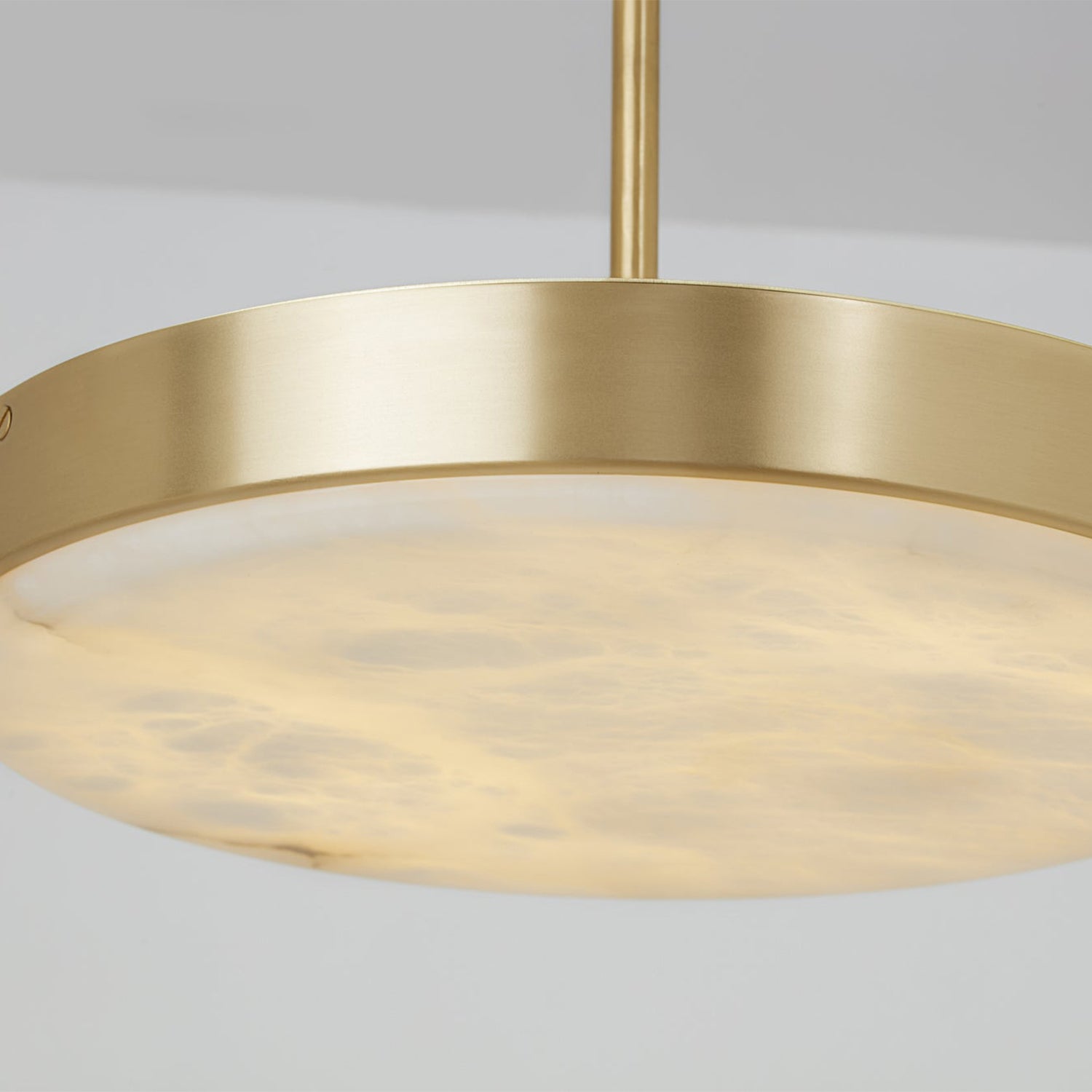 - Hand-honed natural alabaster disc framed in satin brass for organic-modern elegance.