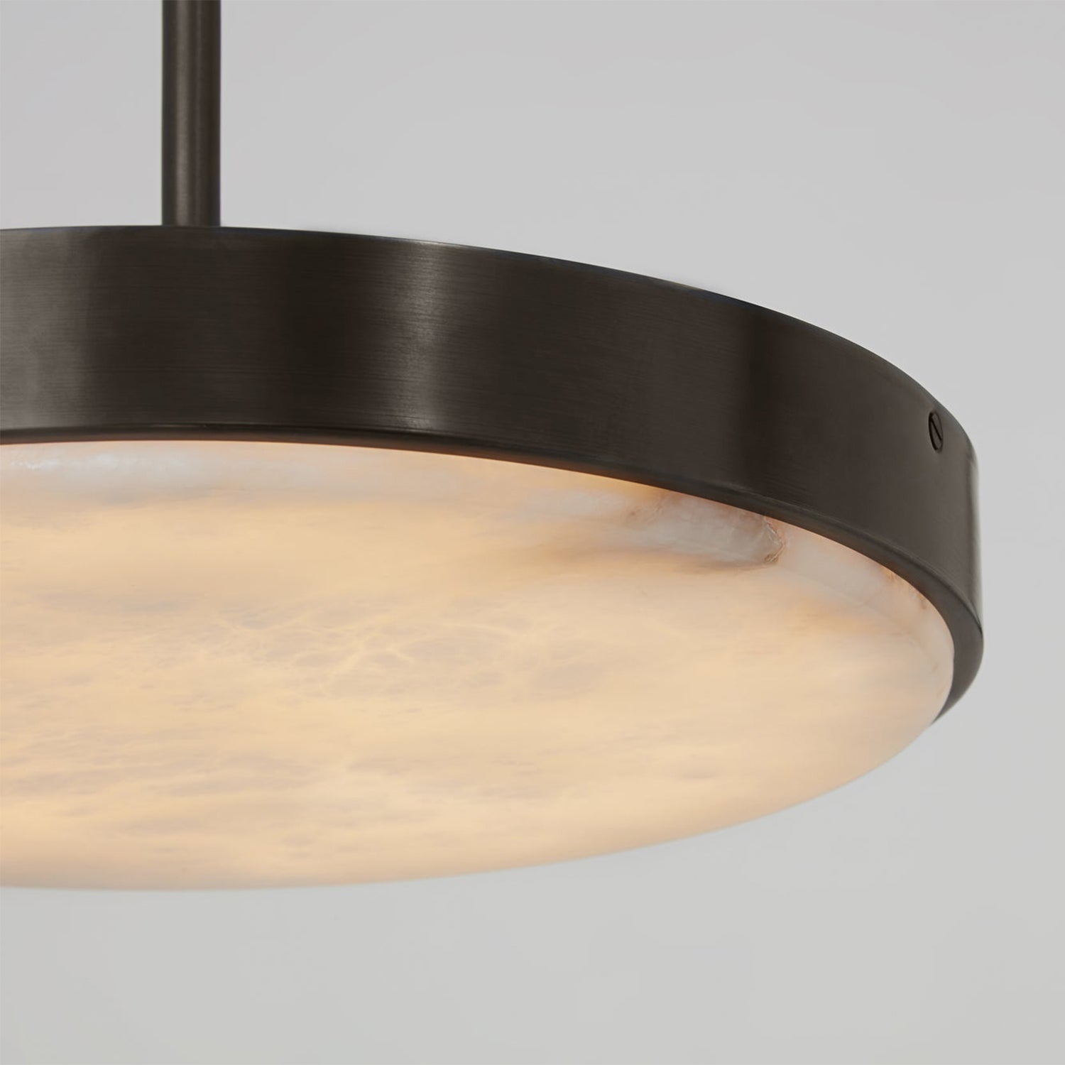 Its exquisite disc of natural alabaster stone. Hanging from three satin brass poles, the translucent disc of honed alabaster is encased within solid satin brass or bronze, creating a pure and elegant piece, while the natural striations within the alabaster produce an individual and distinctive feature.