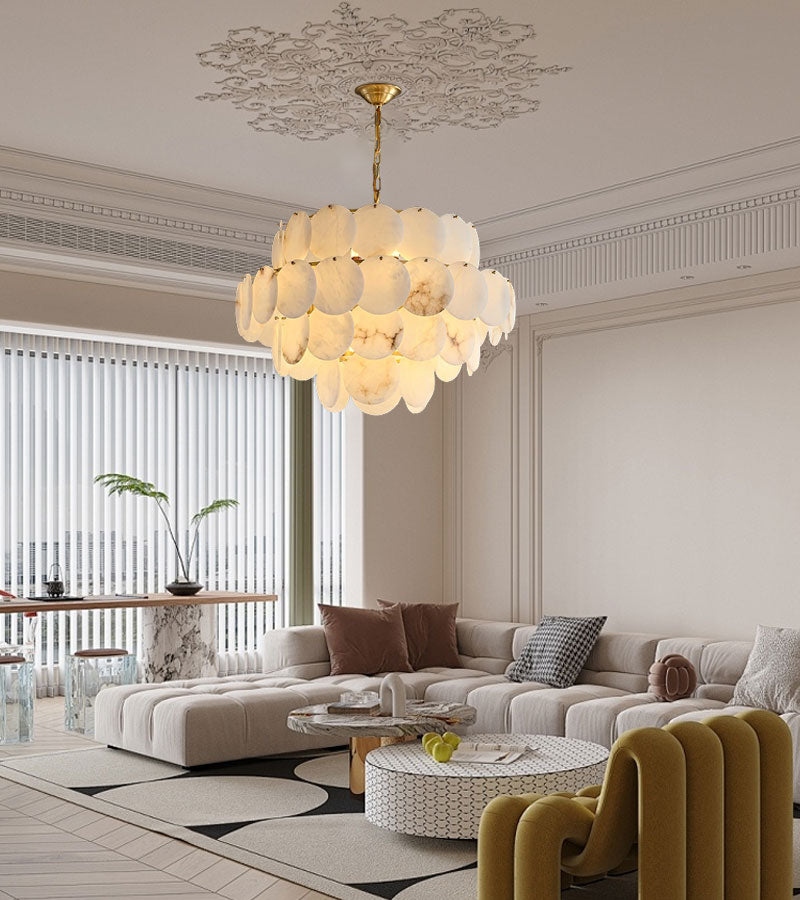 Multi layers Spanish White Alabaster Shell Marble Chandelier lamp in Brass