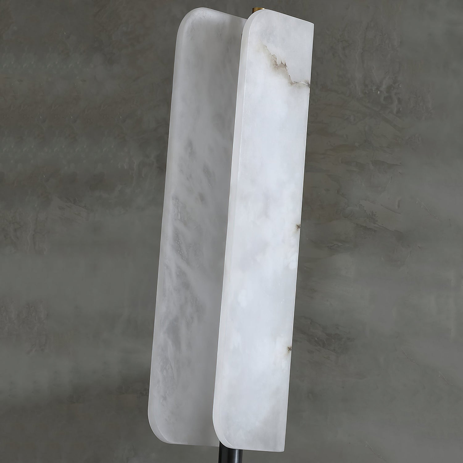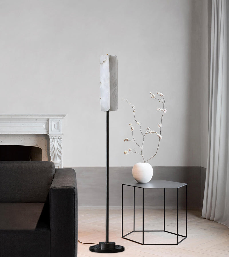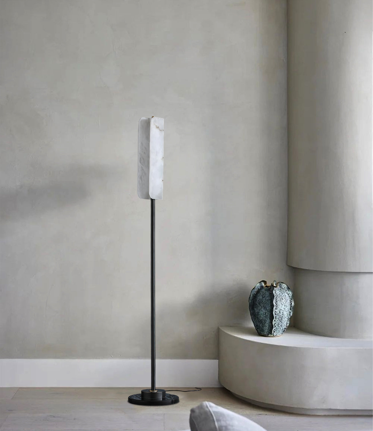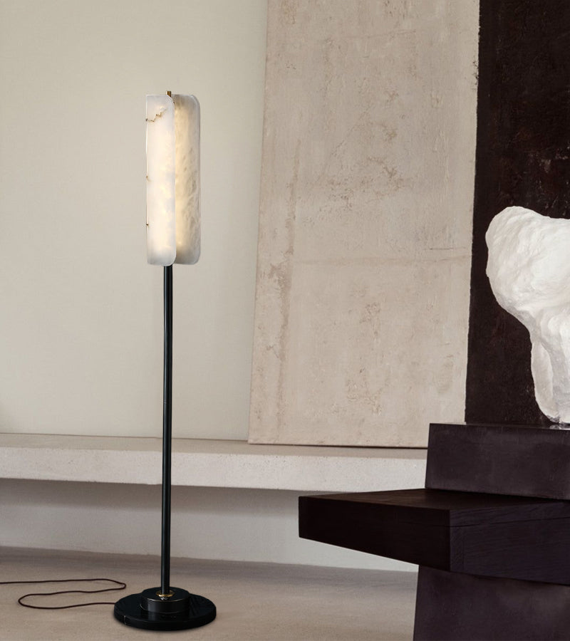 The Alabaster Floor Lamp features a refined, vertical design that emphasizes simplicity and material beauty.