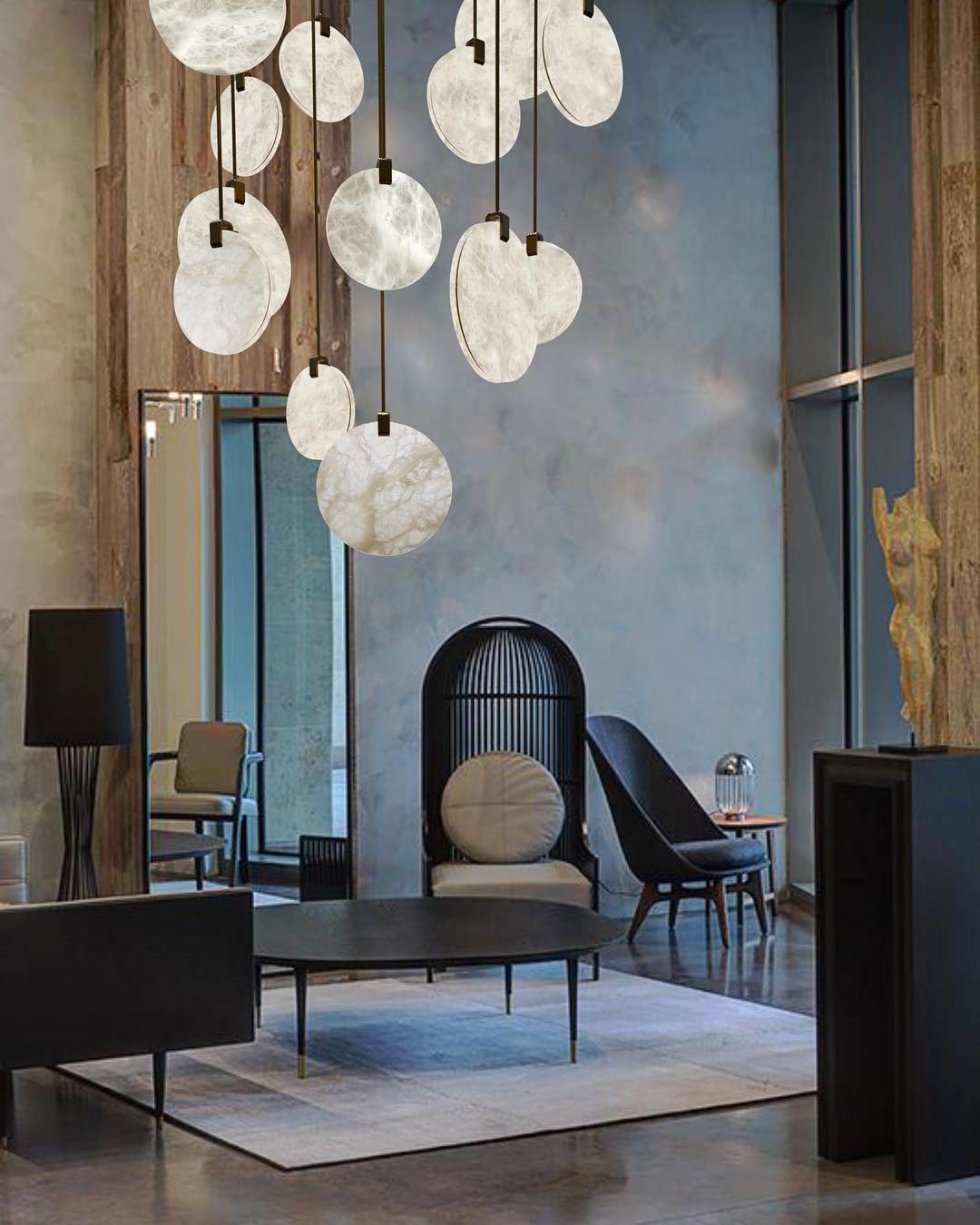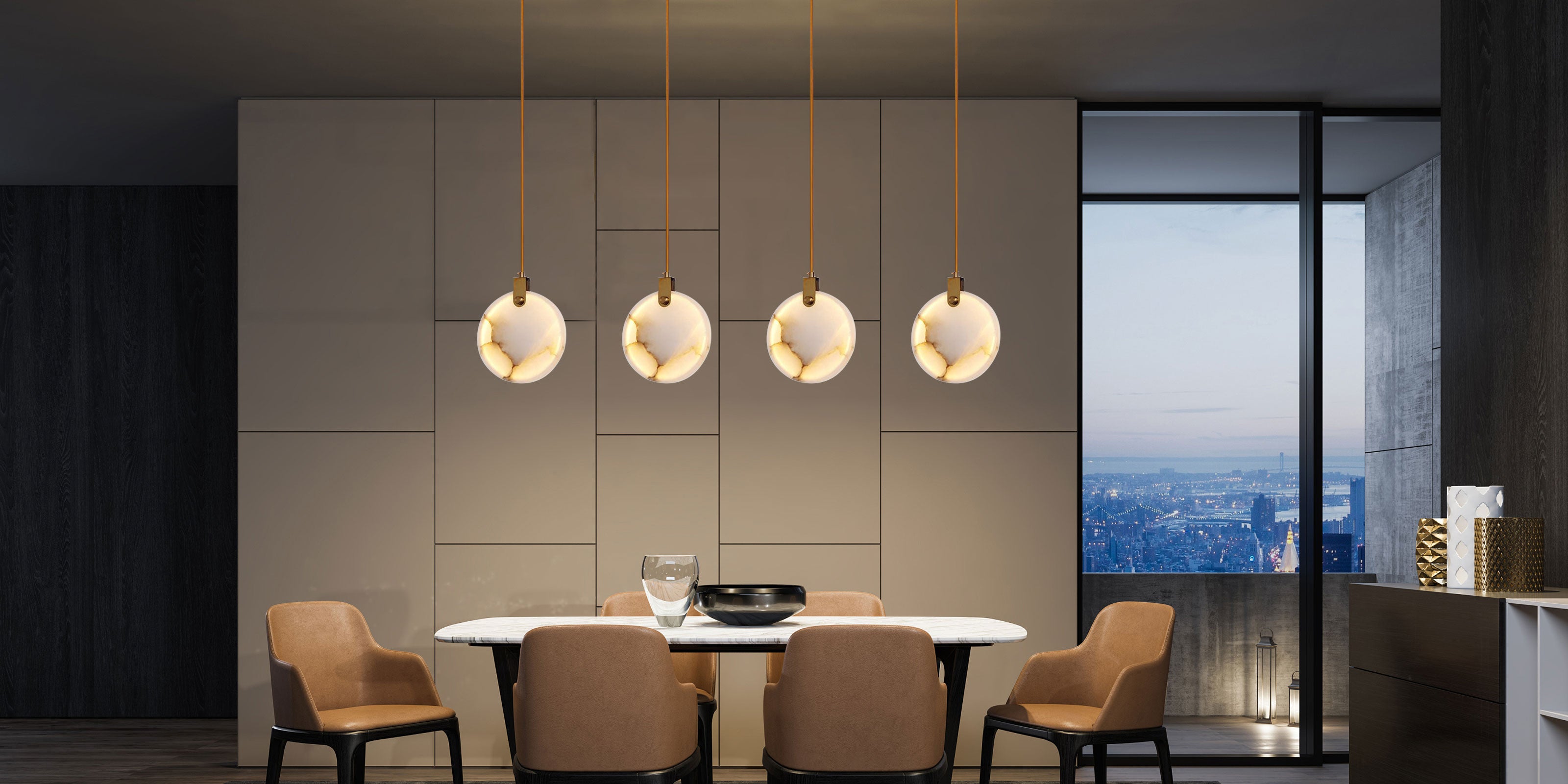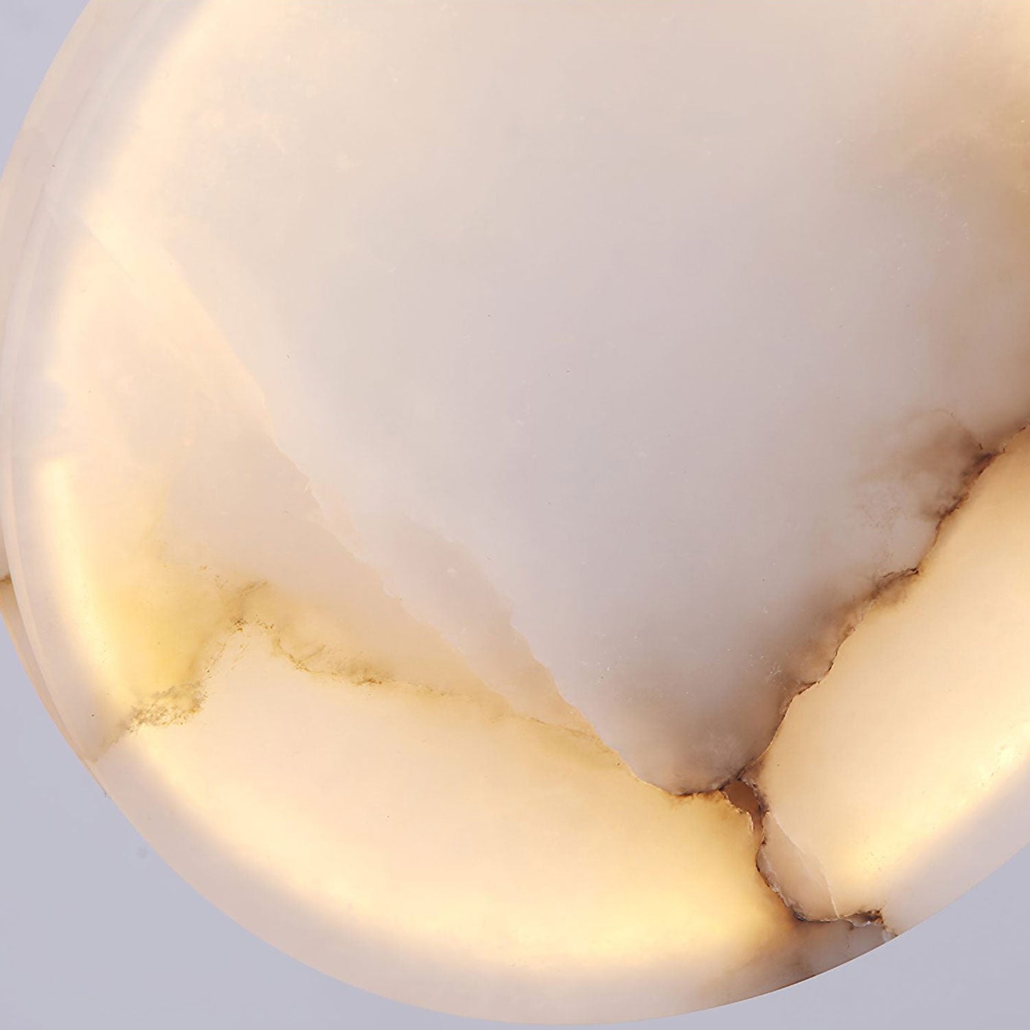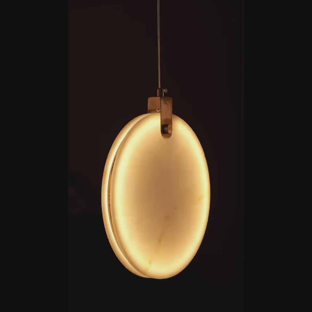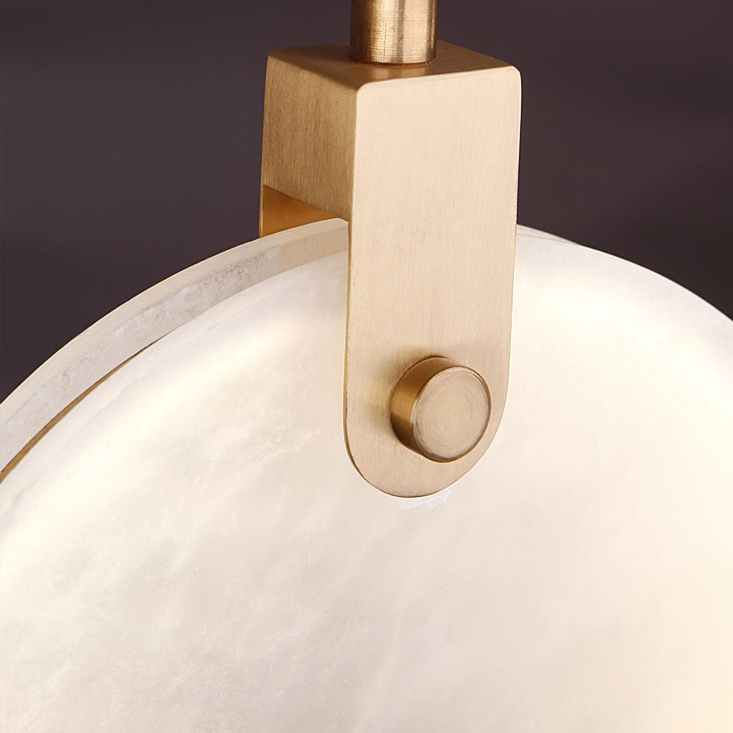 - Modern Geometric Design: Round dual-alabaster discs with antique brass tubing.