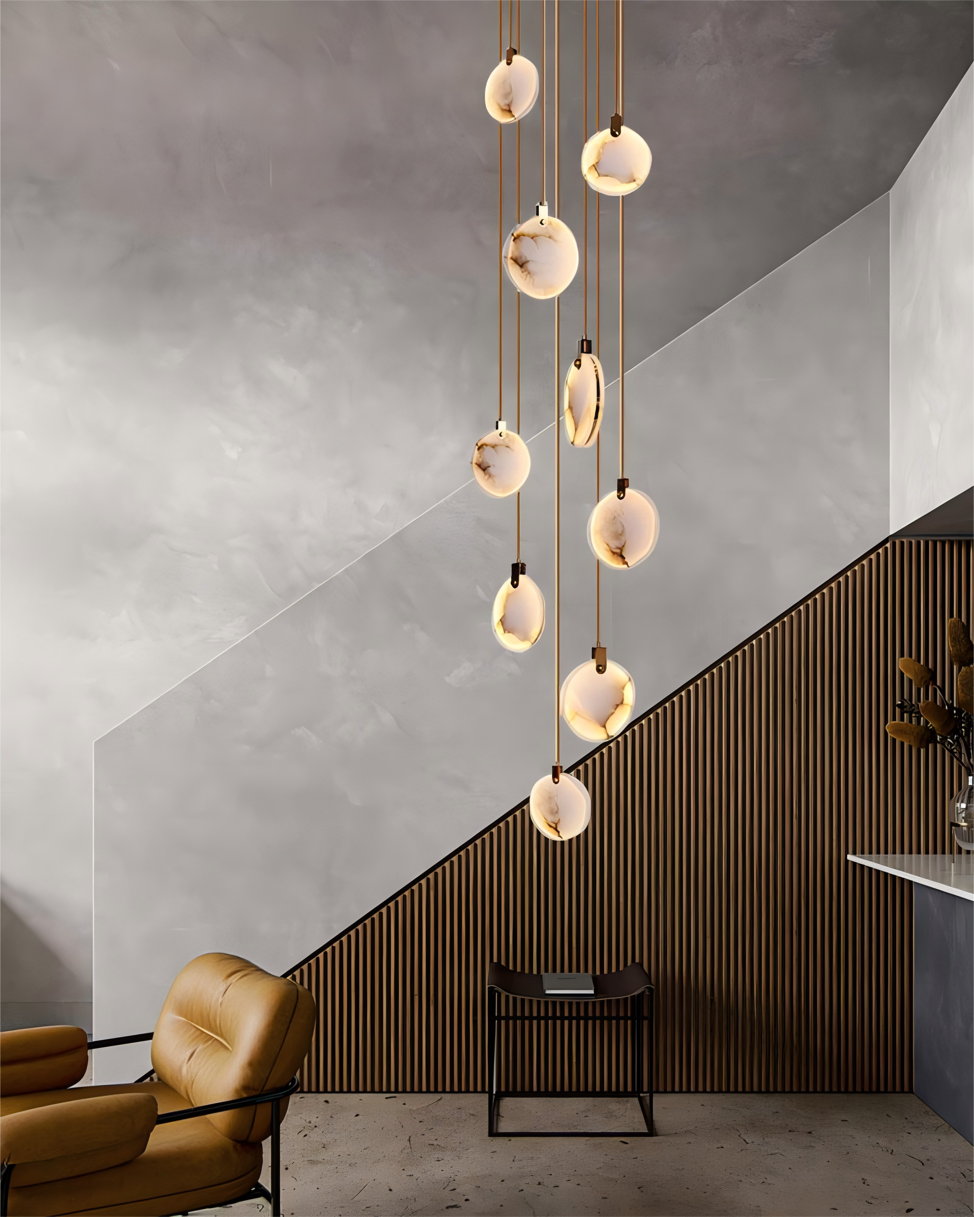 This distinctive Marble Hanging Staircase Chandeliers showcases an elegant gold finish, perfectly complementing its lampshade with a round marble style. Catering to diverse lighting moods, it offers the flexibility to choose between the inviting Warm Light or the refreshing Cool Light options. The blend of luxurious gold with the marble-styled lampshade makes it a sought-after piece for those aiming to add a touch of opulence to their stairwells.