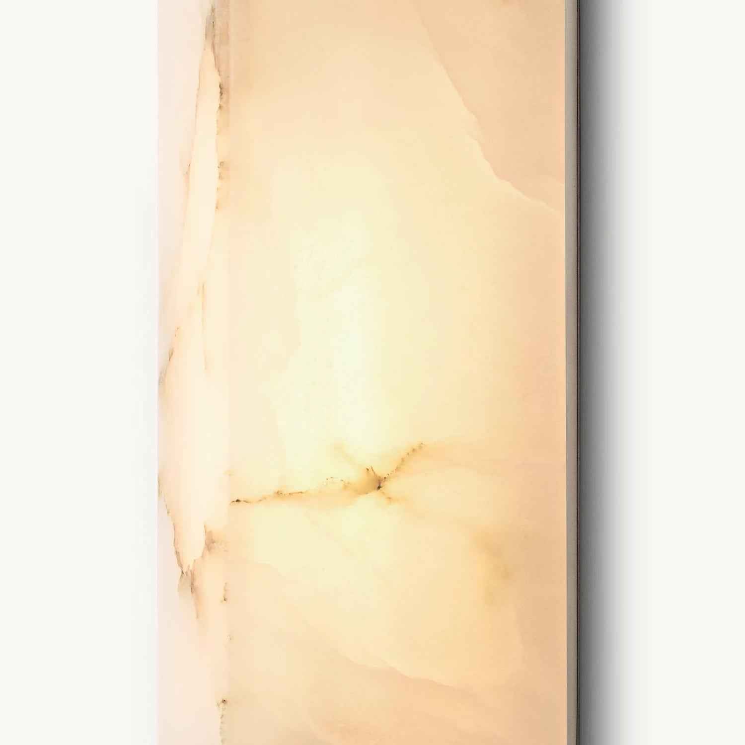 Two sharply angled shades of alabaster are stacked into a minimalist form, punctuated by an exposed metal plate and industrial hardware.
