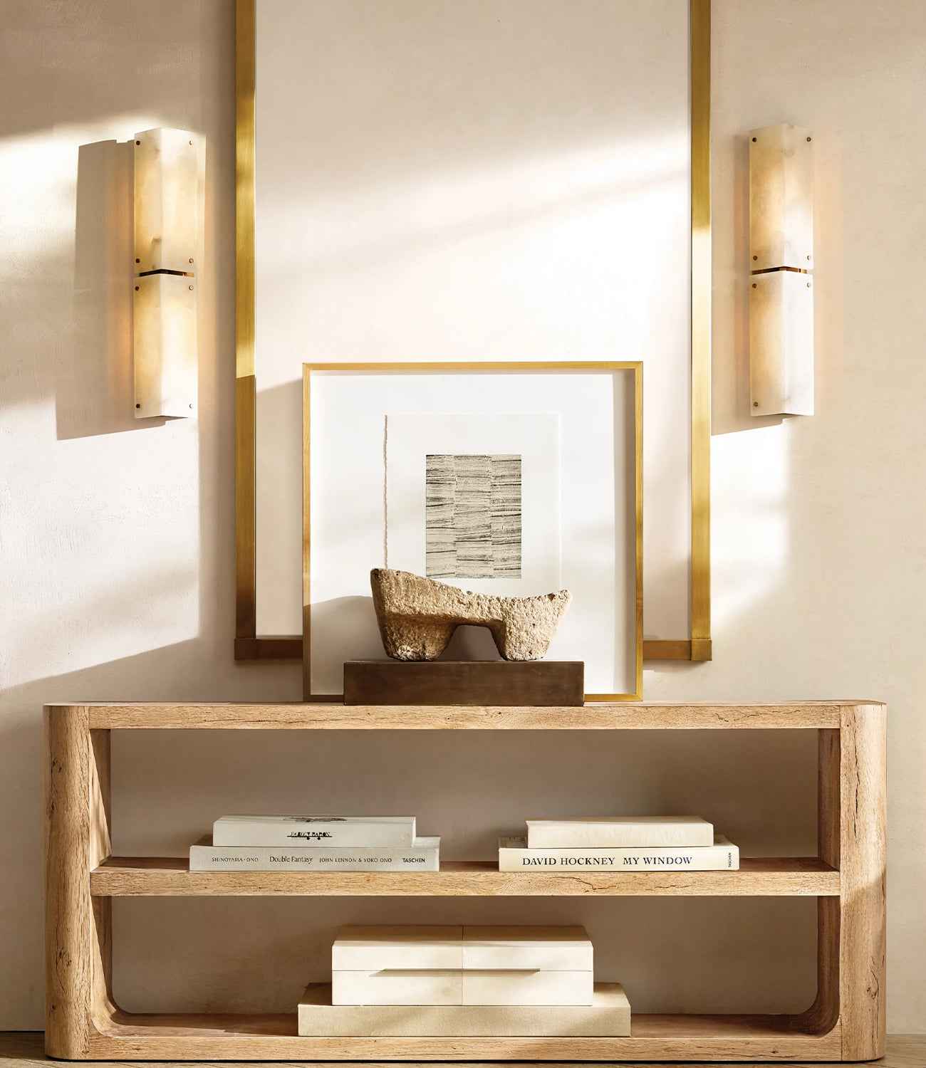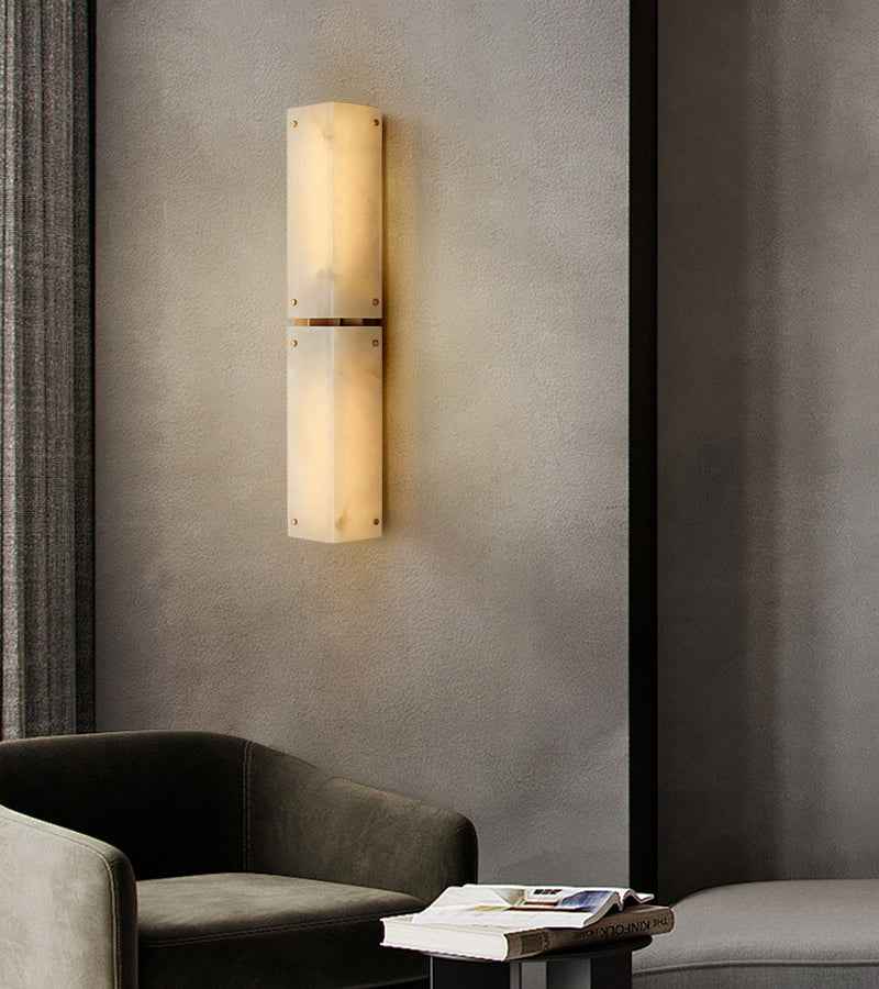 Crafted with meticulous attention to detail, the sconce features two alabaster shades stacked to create a minimalist yet architectural form.