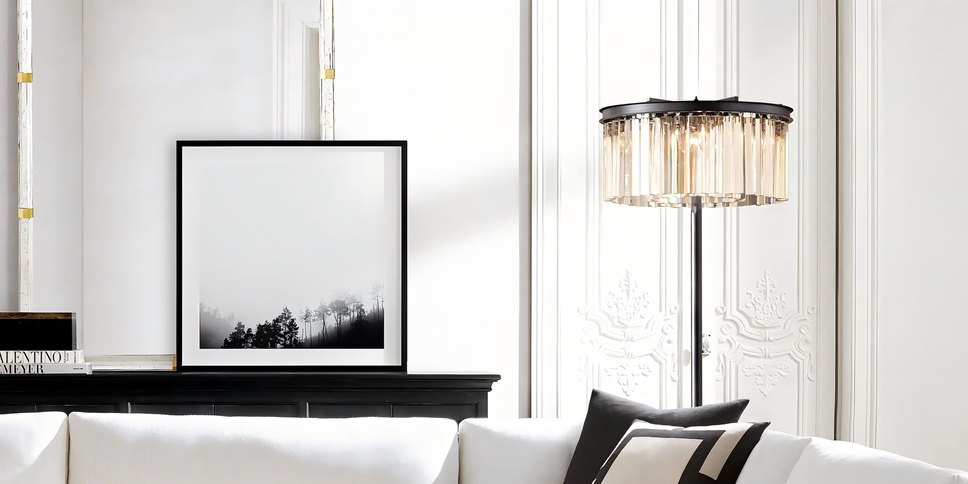 - Clear/smoked beveled glass tiers on a matte black frame create radiant light refraction.