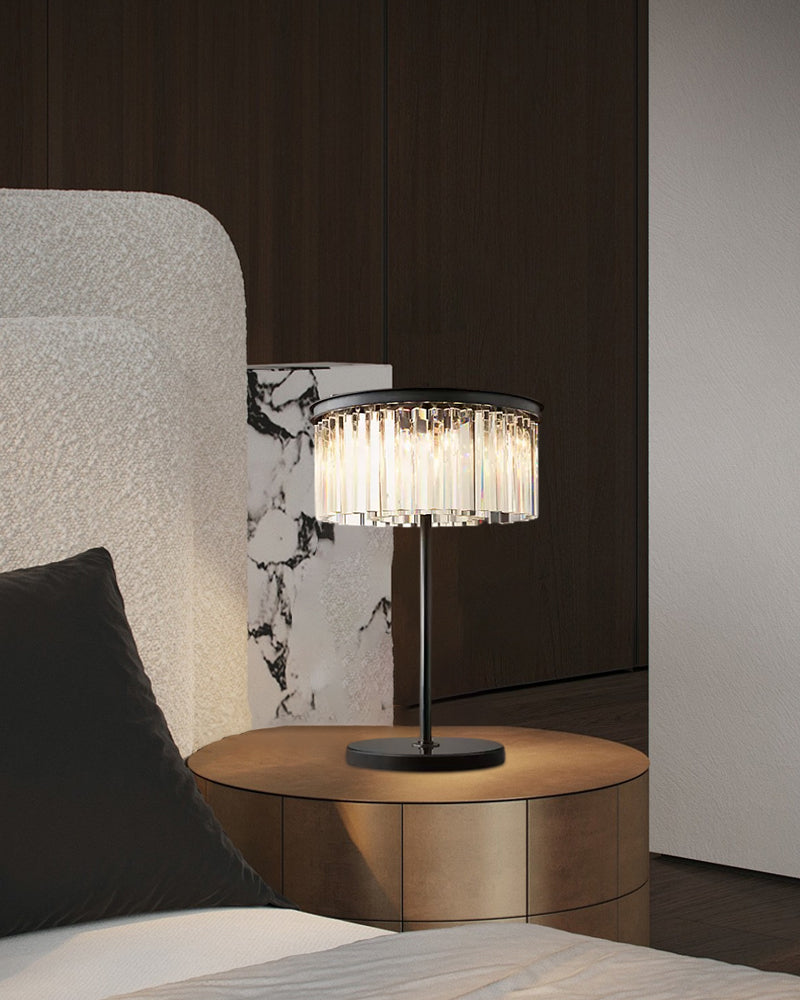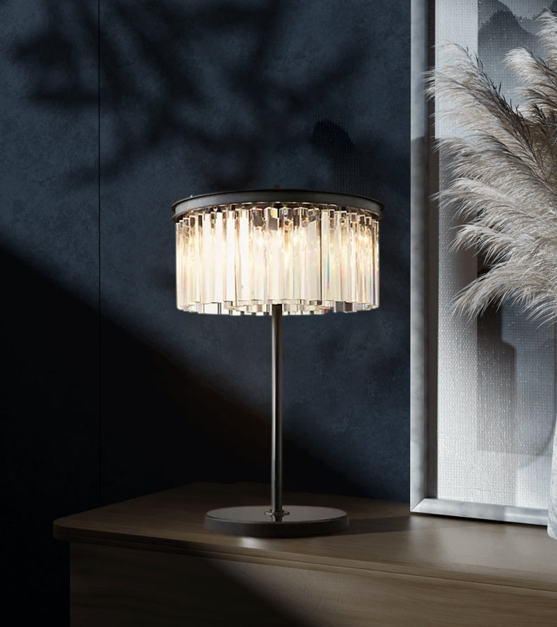 The clear glass prisms line a simple rich black frame in table lamp creating a distinct iridescence that captivates audiences. The beveled glass shimmers like extravagant crystals, housing the light within. This table lamp is a perfect fit in any design spaces whether in your home or office.