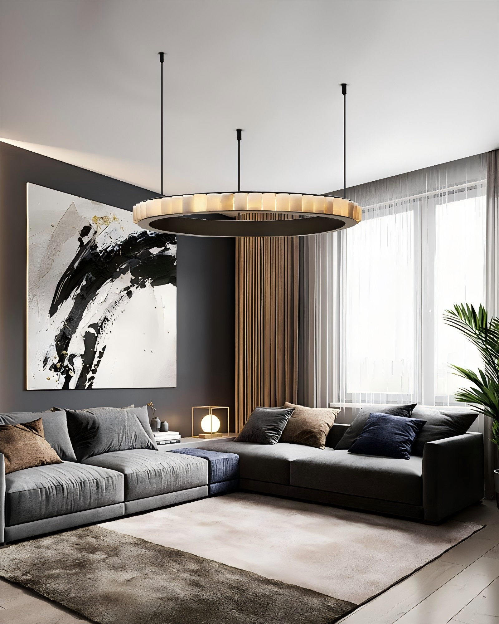 Alabaster Chandelier Elevate your space. Handcrafted with natural marble, this contemporary piece adds style and a soft, warm glow to any room. Experience the calming ambiance and harmonious blend of nature and design.