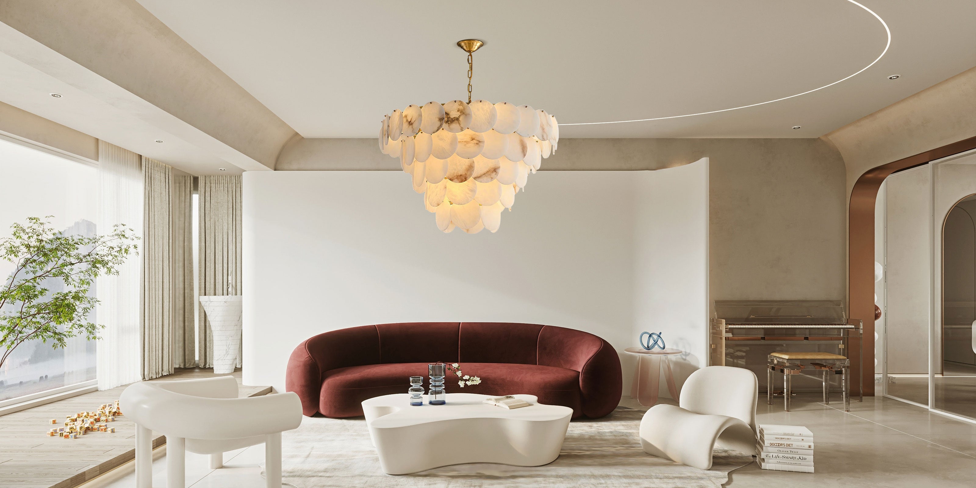 The Alabaster Shell is an exquisite display of natural elegance and luxurious design. Each shell is carefully shaped and polished to a soft sheen, creating a luminous canopy that glows with a warm, inviting light. Suspended from a brass frame, exudes a sense of opulence and refined beauty.