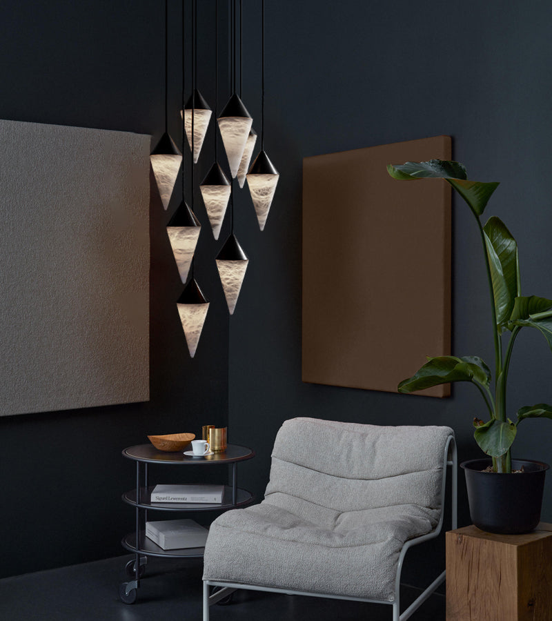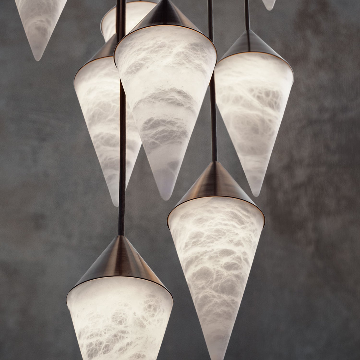 The frame is made of metal and alabaster, giving off a classic vibe. Brass cone shades add sophistication, while below, alabaster cone shades become the highlight, bringing captivating textures with their natural patterns, making the design both stylish and practical.